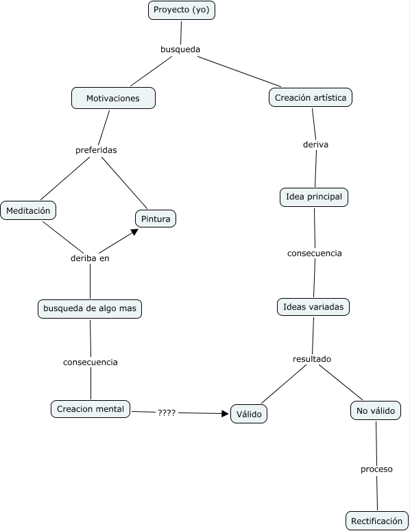 Este Cmap, tiene información relacionada con: mapa conceptual, No válido proceso Rectificación, Proyecto (yo) busqueda Motivaciones, Meditación deriba en Pintura, Creacion mental ???? Válido, Ideas variadas resultado Válido, Proyecto (yo) busqueda Creación artística, Motivaciones preferidas Meditación, Creación artística deriva Idea principal, Motivaciones preferidas Pintura, Meditación deriba en busqueda de algo mas, Idea principal consecuencia Ideas variadas, Ideas variadas resultado No válido, busqueda de algo mas consecuencia Creacion mental