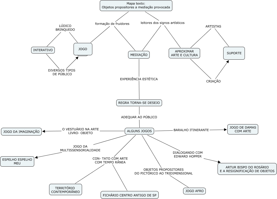 Esse mapa conceitual, produzido no IHMC CmapTools, tem a informação relacionada a: OBJETOS PROPOSITORES, JOGO LÚDICO BRINQUEDO INTERATIVO, APROXIMAR ARTE E CULTURA CRIAÇÃO SUPORTE, ALGUNS JOGOS BARALHO ITINERANTE JOGO DE DAMAS COM ARTE, ALGUNS JOGOS O VESTUÁRIO NA ARTE LIVRO- OBJETO JOGO DA IMAGINAÇÃO, Mapa texto: Objetos propositores a mediação provocada formação de fruidores MEDIAÇÃO, JOGO ???? ????, ALGUNS JOGOS CON- TATO COM ARTE COM TEMPO RÂNEA FICHÁRIO CENTRO ANTIGO DE SP, ALGUNS JOGOS JOGO DA MULTISSENSORIALIDADE ESPELHO ESPELHO MEU, JOGO ???? ????, Mapa texto: Objetos propositores a mediação provocada leitores dos signos artísticos APROXIMAR ARTE E CULTURA, ALGUNS JOGOS DIALOGANDO COM EDWARD HOPPER ARTUR BISPO DO ROSÁRIO E A RESIGNIFICAÇÃO DE OBJETOS, ALGUNS JOGOS OBJETOS PROPOSITORES DO PICTÓRICO AO TRIDIMENSIONAL JOGO AFRO, ALGUNS JOGOS CON- TATO COM ARTE COM TEMPO RÂNEA TERRITÓRIO CONTEMPORÂNEO, REGRA TORNA-SE DESEJO ADEQUAR AO PÚBLICO ALGUNS JOGOS, Mapa texto: Objetos propositores a mediação provocada formação de fruidores JOGO, Mapa texto: Objetos propositores a mediação provocada leitores dos signos artísticos MEDIAÇÃO, INTERATIVO DIVERSOS TIPOS DE PÚBLICO ????, APROXIMAR ARTE E CULTURA ARTISTAS SUPORTE, MEDIAÇÃO EXPERIÊNCIA ESTÉTICA REGRA TORNA-SE DESEJO