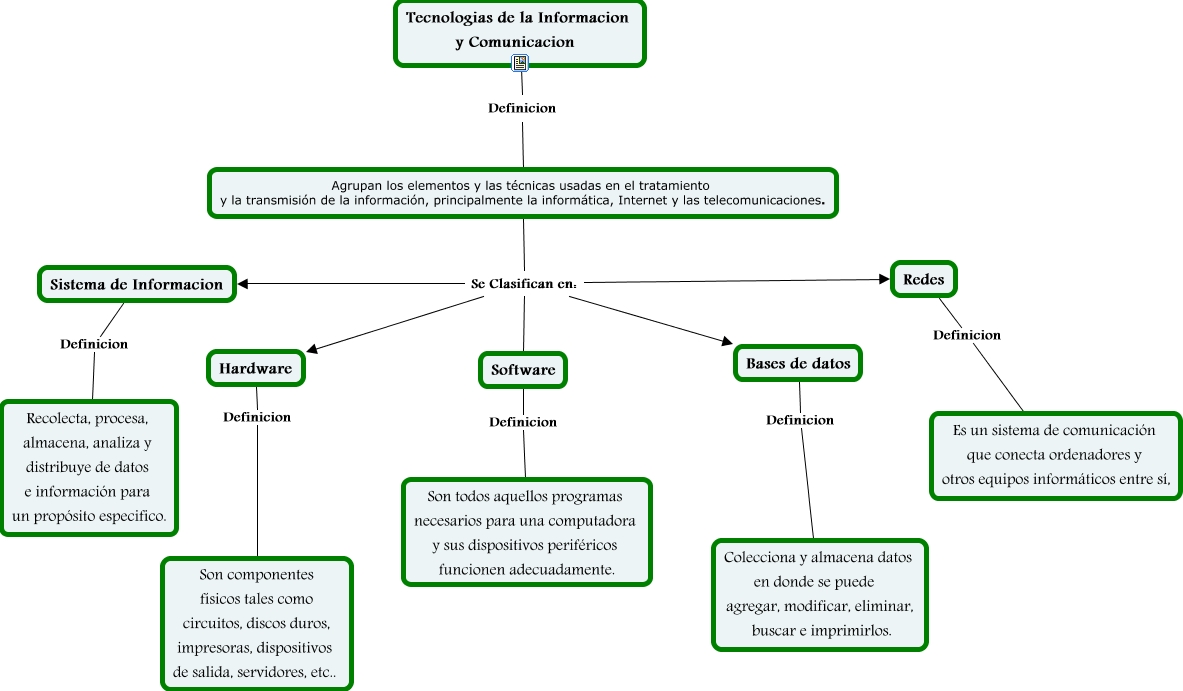 Este Cmap, tiene información relacionada con: TIC, Hardware Definicion Son componentes físicos tales como circuitos, discos duros, impresoras, dispositivos de salida, servidores, etc.., Tecnologias de la Informacion y Comunicacion Definicion Agrupan los elementos y las técnicas usadas en el tratamiento y la transmisión de la información, principalmente la informática, Internet y las telecomunicaciones., Agrupan los elementos y las técnicas usadas en el tratamiento y la transmisión de la información, principalmente la informática, Internet y las telecomunicaciones. Se Clasifican en: Sistema de Informacion, Sistema de Informacion Definicion Recolecta, procesa, almacena, analiza y distribuye de datos e información para un propósito especifico., Software Definicion Son todos aquellos programas necesarios para una computadora y sus dispositivos periféricos funcionen adecuadamente., Agrupan los elementos y las técnicas usadas en el tratamiento y la transmisión de la información, principalmente la informática, Internet y las telecomunicaciones. Se Clasifican en: Hardware, Bases de datos Definicion Colecciona y almacena datos en donde se puede agregar, modificar, eliminar, buscar e imprimirlos., Agrupan los elementos y las técnicas usadas en el tratamiento y la transmisión de la información, principalmente la informática, Internet y las telecomunicaciones. Se Clasifican en: Redes, Agrupan los elementos y las técnicas usadas en el tratamiento y la transmisión de la información, principalmente la informática, Internet y las telecomunicaciones. Se Clasifican en: Software, Redes Definicion Es un sistema de comunicación que conecta ordenadores y otros equipos informáticos entre sí,, Agrupan los elementos y las técnicas usadas en el tratamiento y la transmisión de la información, principalmente la informática, Internet y las telecomunicaciones. Se Clasifican en: Bases de datos