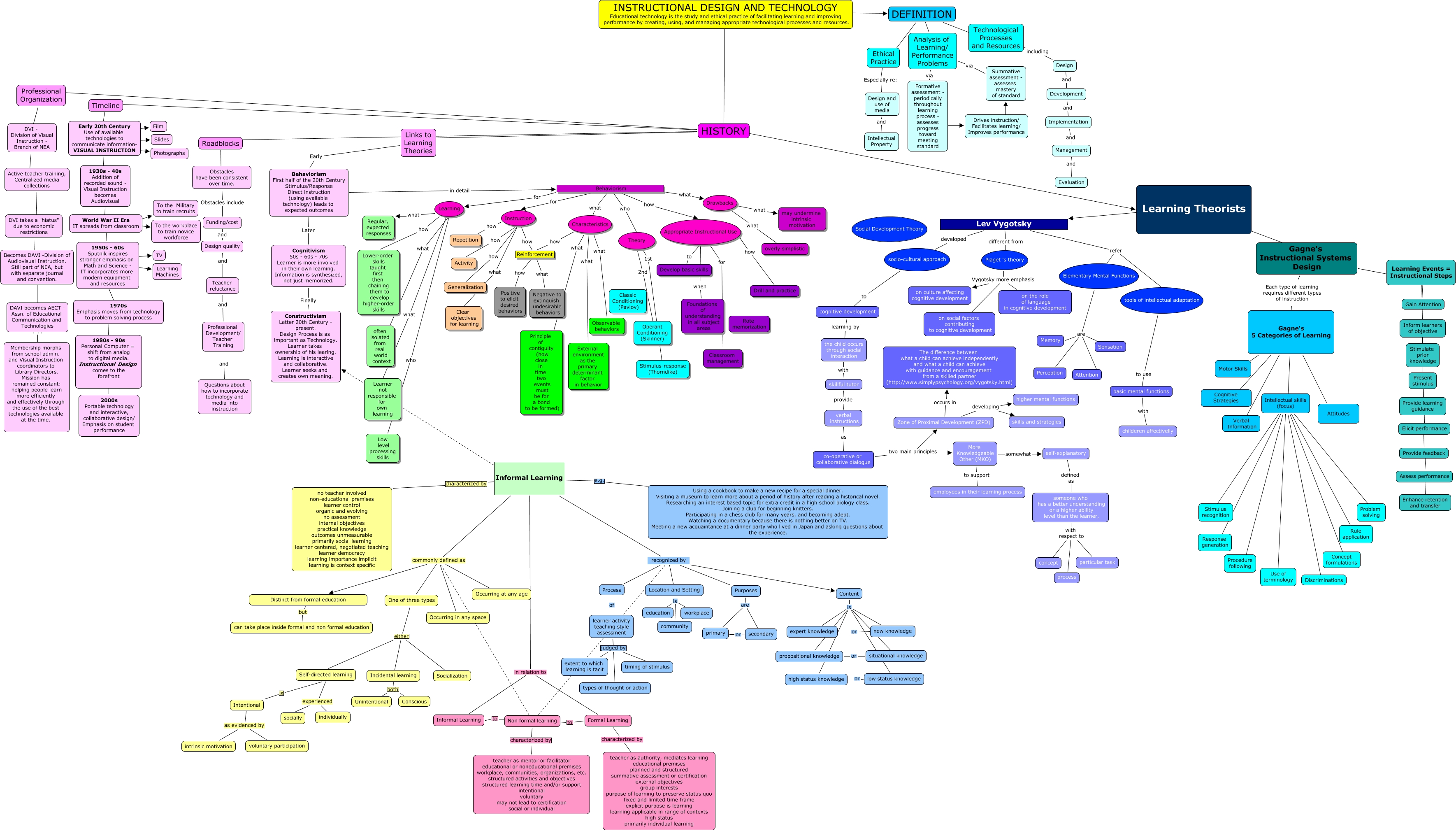 This Concept Map, created with IHMC CmapTools, has information related to: Group 1 Knowledge Map, learner activity teaching style assessment judged by extent to which learning is tacit, HISTORY ???? Learning Theorists, Intellectual skills (focus) ???? Use of terminology, Characteristics how Reinforcement, Intellectual skills (focus) ???? Discriminations, Lev Vygotsky Social Development Theory, Intellectual skills (focus) ???? Response generation, 1950s - 60s Sputnik inspires stronger emphasis on Math and Science - IT incorporates more modern equipment and resources ???? 1970s Emphasis moves from technology to problem solving process, Elementary Mental Functions are Perception, learner activity teaching style assessment judged by types of thought or action, Lev Vygotsky developed socio-cultural approach, individually experienced Self-directed learning, Design and use of media and Intellectual Property, Appropriate Instructional Use when Foundations of understanding in all subject areas, skillful tutor provide verbal instructions, Learning how Lower-order skills taught first then chaining them to develop higher-order skills, Professional Development/ Teacher Training and Questions about how to incorporate technology and media into instruction, Early 20th Century Use of available technologies to communicate information- VISUAL INSTRUCTION ???? 1930s - 40s Addition of recorded sound - Visual Instruction becomes Audiovisual, Location and Setting is workplace, Piaget 's theory Vygotsky more emphasis on culture affecting cognitive development
