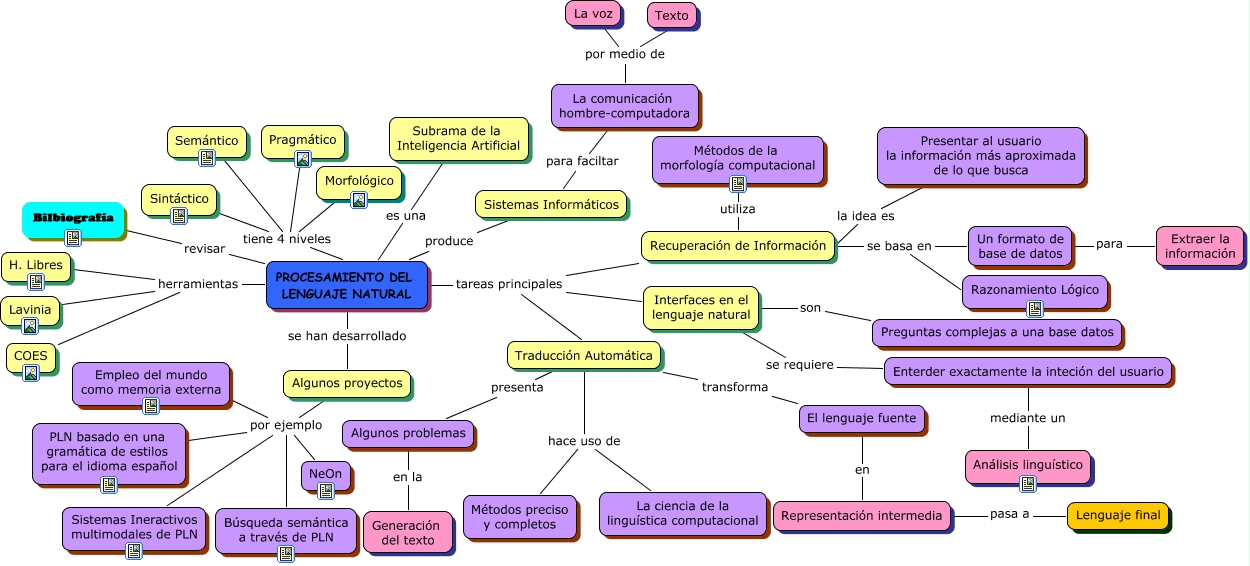 Este Cmap, tiene información relacionada con: PLN, Empleo del mundo como memoria externa por ejemplo Búsqueda semántica a través de PLN, Empleo del mundo como memoria externa por ejemplo NeOn, Traducción Automática hace uso de La ciencia de la linguística computacional, Un formato de base de datos se basa en Razonamiento Lógico, El lenguaje fuente en Representación intermedia, Empleo del mundo como memoria externa por ejemplo Sistemas Ineractivos multimodales de PLN, Recuperación de Información se basa en Razonamiento Lógico, PLN basado en una gramática de estilos para el idioma español por ejemplo Sistemas Ineractivos multimodales de PLN, Algunos proyectos por ejemplo NeOn, PLN basado en una gramática de estilos para el idioma español por ejemplo NeOn, Algunos problemas en la Generación del texto, Algunos proyectos por ejemplo Sistemas Ineractivos multimodales de PLN, Enterder exactamente la inteción del usuario mediante un Análisis linguístico, Traducción Automática hace uso de Métodos preciso y completos, Recuperación de Información tareas principales Traducción Automática, PROCESAMIENTO DEL LENGUAJE NATURAL se han desarrollado Algunos proyectos, Traducción Automática presenta Algunos problemas, PLN basado en una gramática de estilos para el idioma español por ejemplo Búsqueda semántica a través de PLN, Interfaces en el lenguaje natural tareas principales Traducción Automática, PROCESAMIENTO DEL LENGUAJE NATURAL tareas principales Traducción Automática