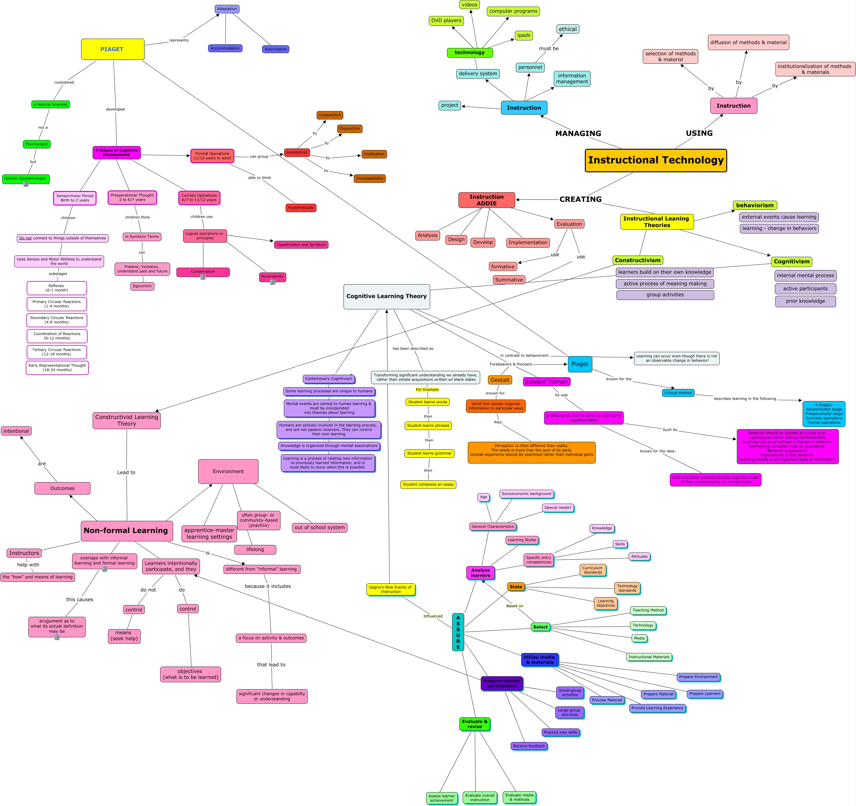 This Concept Map, created with IHMC CmapTools, has information related to: Group 2 Cmap, 4 Stages of Cognitive Development ???? Sensorimotor Period Birth to 2 years, A S S U R E E Evaluate & revise, A S S U R E R Require learner partcipation, PIAGET considered a Natural Scientist, Instruction ADDIE ???? Develop, Transforming significant understanding we already have, rather than simple acquisitions written on blank slates For Example Student learns words, Student learns grammar then Student composes an essay, Evaluate & revise Evaluate media & methods, Require learner partcipation ???? Receive feedback, Adaptation ???? Assimilation, Gagne's Nine Events of Instruction ???? Cognitive Learning Theory, Specific entry competencies ???? Knowledge, possibilities by Implication, Adaptation ???? Accommodation, PIAGET represents Adaptation, Environment ???? lifelong, Instructional Technology USING Instruction, Select ???? Media, Instruction ADDIE ???? Implementation, Instruction ???? personnel