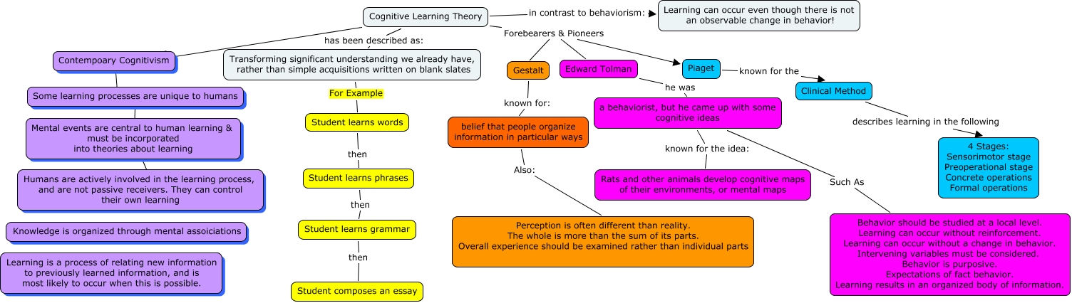 This Concept Map, created with IHMC CmapTools, has information related to: Cognitive Learning Theory Mindmap, Cognitive Learning Theory Contempoary Cognitivism, Piaget known for the Clinical Method, Mental events are central to human learning & must be incorporated into theories about learning ???? Humans are actively involved in the learning process, and are not passive receivers. They can control their own learning, Gestalt known for: belief that people organize information in particular ways, Contempoary Cognitivism ???? Some learning processes are unique to humans, Some learning processes are unique to humans ???? Mental events are central to human learning & must be incorporated into theories about learning, Clinical Method describes learning in the following 4 Stages: Sensorimotor stage Preoperational stage Concrete operations Formal operations, Transforming significant understanding we already have, rather than simple acquisitions written on blank slates For Example Student learns words, belief that people organize information in particular ways Also: Perception is often different than reality. The whole is more than the sum of its parts. Overall experience should be examined rather than individual parts, Cognitive Learning Theory Forebearers & Pioneers Piaget, Edward Tolman he was a behaviorist, but he came up with some cognitive ideas, Mental events are central to human learning & must be incorporated into theories about learning ???? Humans are actively involved in the learning process, and are not passive receivers. They can control their own learning, Student learns grammar then Student composes an essay, Cognitive Learning Theory has been described as: Transforming significant understanding we already have, rather than simple acquisitions written on blank slates, a behaviorist, but he came up with some cognitive ideas Such As Behavior should be studied at a local level. Learning can occur without reinforcement. Learning can occur without a change in behavior. Intervening variables must be considered. Behavior is purposive. Expectations of fact behavior. Learning results in an organized body of information., Cognitive Learning Theory Forebearers & Pioneers Gestalt, Edward Tolman Forebearers & Pioneers Piaget, a behaviorist, but he came up with some cognitive ideas known for the idea: Rats and other animals develop cognitive maps of their environments, or mental maps, Cognitive Learning Theory in contrast to behaviorism: Learning can occur even though there is not an observable change in behavior!, Edward Tolman Forebearers & Pioneers Gestalt