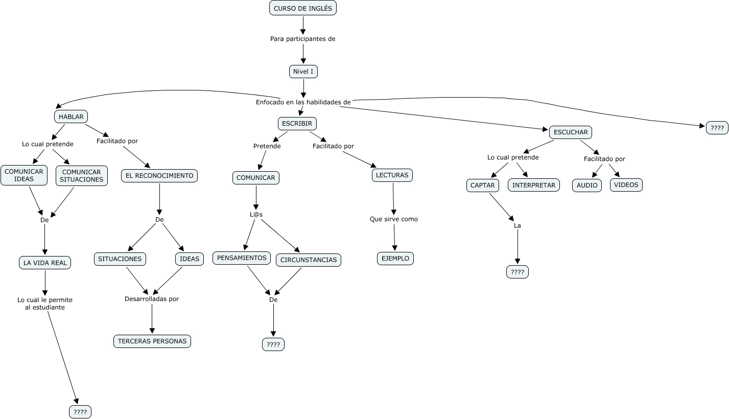 Este Cmap, tiene información relacionada con: ELMER TABORDA BONILLA, PENSAMIENTOS De ????, COMUNICAR L@s CIRCUNSTANCIAS, Nivel I Enfocado en las habilidades de ESCRIBIR, COMUNICAR L@s PENSAMIENTOS, IDEAS Desarrolladas por TERCERAS PERSONAS, EL RECONOCIMIENTO De IDEAS, EL RECONOCIMIENTO De SITUACIONES, HABLAR Lo cual pretende COMUNICAR IDEAS, SITUACIONES Desarrolladas por TERCERAS PERSONAS, ESCUCHAR Lo cual pretende CAPTAR, ESCUCHAR Facilitado por AUDIO, CURSO DE INGLÉS Para participantes de Nivel I, CIRCUNSTANCIAS De ????, HABLAR Facilitado por EL RECONOCIMIENTO, CAPTAR La ????, ESCUCHAR Lo cual pretende INTERPRETAR, ESCRIBIR Pretende COMUNICAR, Nivel I Enfocado en las habilidades de ????, Nivel I Enfocado en las habilidades de ESCUCHAR, ESCRIBIR Facilitado por LECTURAS