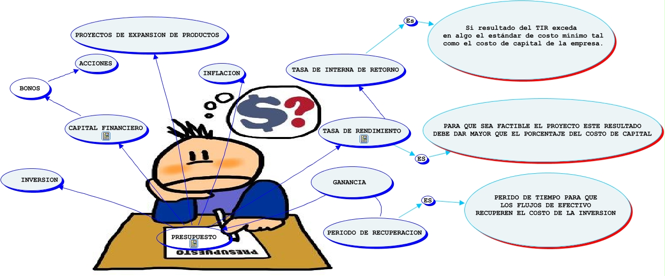 Este Cmap, tiene información relacionada con: FINANCIERO 1 NIB, GANANCIA PRESUPUESTO PROYECTOS DE EXPANSION DE PRODUCTOS, CAPITAL FINANCIERO BONOS ACCIONES, GANANCIA PRESUPUESTO TASA DE RENDIMIENTO, GANANCIA PRESUPUESTO INFLACION, TASA DE INTERNA DE RETORNO Es Si resultado del TIR exceda en algo el estándar de costo mínimo tal como el costo de capital de la empresa., GANANCIA PRESUPUESTO CAPITAL FINANCIERO, PERIODO DE RECUPERACION ES PERIDO DE TIEMPO PARA QUE LOS FLUJOS DE EFECTIVO RECUPEREN EL COSTO DE LA INVERSION, TASA DE RENDIMIENTO ES PARA QUE SEA FACTIBLE EL PROYECTO ESTE RESULTADO DEBE DAR MAYOR QUE EL PORCENTAJE DEL COSTO DE CAPITAL, PERIODO DE RECUPERACION ???? ????, GANANCIA PRESUPUESTO INVERSION, TASA DE RENDIMIENTO ???? TASA DE INTERNA DE RETORNO