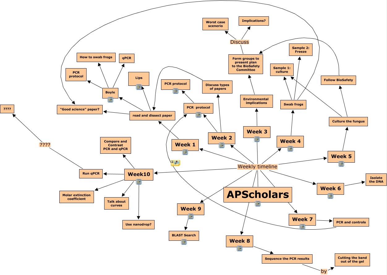 This Concept Map, created with IHMC CmapTools, has information related to: APScholars Timeline Cmap, Run qPCR ???? ????, Environmental implications Form groups to present plan to the BioSafety Committee, Boyle How to swab frogs, Week 8 Sequence the PCR results, PCR and controls PCR protocol, APScholars Weekly timeline Week 7, Boyle PCR protocol, read and dissect paper Lips, Swab frogs Sample 2: Freeze, APScholars Weekly timeline Week 3, PCR protocol PCR protocol, APScholars Weekly timeline Week 8, Form groups to present plan to the BioSafety Committee Discuss Implications?, Boyle qPCR, APScholars Weekly timeline Week 1, Culture the fungus Sample 1: culture, Week 3 Environmental implications, Follow BioSafety Form groups to present plan to the BioSafety Committee, Week 4 Swab frogs, Week10 Compare and Contrast PCR and qPCR