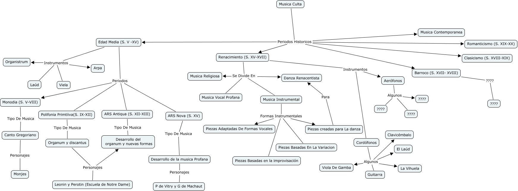 Este Cmap, tiene información relacionada con: Musica culta, Edad Media (S. V -XV) Periodos ARS Antiqua (S. XII-XIII), ARS Antiqua (S. XII-XIII) Tipo De Musica Desarrollo del organum y nuevas formas, Renacimiento (S. XV-XVII) Instrumentos Cordófonos, Canto Gregoriano Personajes Monjes, Musica Instrumental Formas Instrumentales Piezas Adaptadas De Formas Vocales, Monodia (S. V-VIII) Tipo De Musica Canto Gregoriano, Musica Culta Periodos Historicos Clasicismo (S. XVIII-XIX), Cordófonos Algunos La Vihuela, Organum y discantus Personajes Desarrollo del organum y nuevas formas, Musica Culta Periodos Historicos Romanticismo (S. XIX-XX), Edad Media (S. V -XV) Periodos ARS Nova (S. XV), Musica Culta Periodos Historicos Edad Media (S. V -XV), Barroco (S. XVII- XVIII) ???? ????, Cordófonos Algunos Guitarra, Edad Media (S. V -XV) Instrumentos Organistrum, Musica Culta Periodos Historicos Renacimiento (S. XV-XVII), Musica Culta Periodos Historicos Musica Contemporanea, Aerófonos Algunos ????, Musica Instrumental Formas Instrumentales Piezas Basadas en la improvisación, Polifonia Primtiiva(S. IX-XII) Tipo De Musica Organum y discantus
