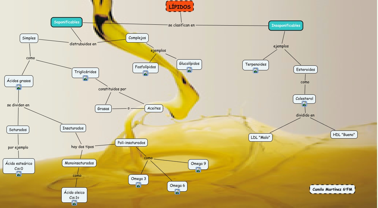 Este Cmap, tiene información relacionada con: LípidosMartinez, Poli-insaturados como Omega 6, Colesterol dividido en HDL "Bueno", Ácidos grasos se dividen en Insaturados, Complejos ejemplos Glucolípidos, Esteroides como Colesterol, Complejos ejemplos Fosfolípidos, Simples como Ácidos grasos, Insaturados hay dos tipos Monoinsaturados, LÍPIDOS se clasifican en Saponificables, Insaturados hay dos tipos Poli-insaturados, Poli-insaturados como Omega 3, LÍPIDOS se clasifican en Insaponificables, Triglicéridos constituidos por Grasas, Insaponificables ejemplos Esteroides, Grasas o Aceites, Poli-insaturados como Omega 9, Saponificables distrubuidos en Complejos, Saponificables distrubuidos en Simples, Insaponificables ejemplos Terpenoides, Saturados por ejemplo Ácido esteárico C18:0