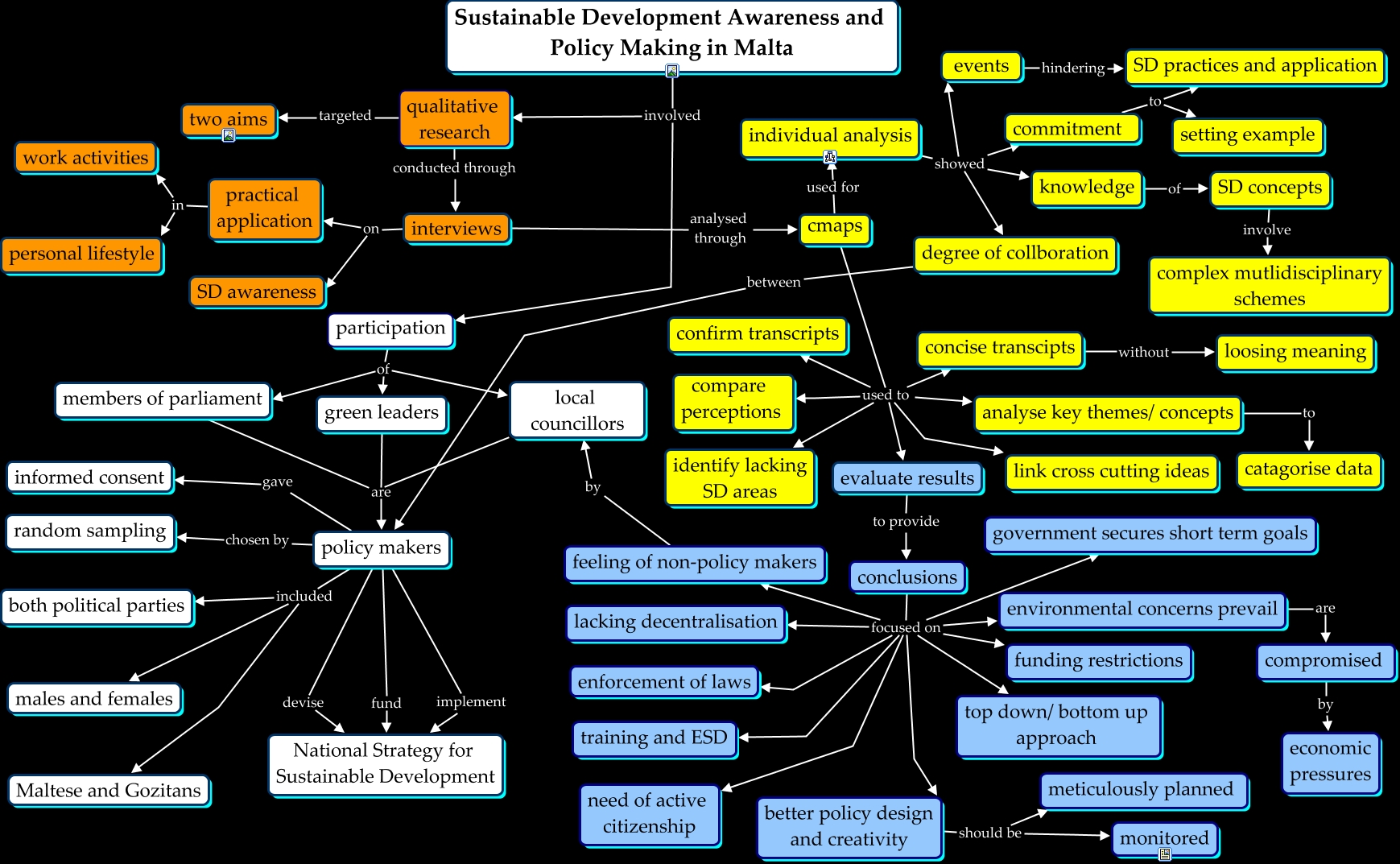 This Concept Map, created with IHMC CmapTools, has information related to: SD awareness, commitment to SD practices and application, interviews on practical application, degree of collboration between policy makers, conclusions focused on enforcement of laws, conclusions focused on funding restrictions, policy makers included both political parties, policy makers implement National Strategy for Sustainable Development, policy makers included Maltese and Gozitans, conclusions focused on training and ESD, cmaps used to evaluate results, cmaps used to concise transcipts, practical application in work activities, compromised by economic pressures, conclusions focused on environmental concerns prevail, participation of local councillors, individual analysis showed knowledge, SD concepts involve complex mutlidisciplinary schemes, cmaps used to analyse key themes/ concepts, policy makers gave informed consent, cmaps used for individual analysis