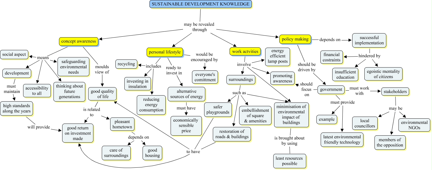 This Concept Map, created with IHMC CmapTools, has information related to: Sean, alternative sources of energy must have economically sensible price, concept awareness means thinking about future generations, successful implementation hindered by egoistic mentality of citizens, personal lifestyle would be encouraged by everyone's comittment, development must maintain high standards along the years, concept awareness means accessibility to all, stakeholders may be members of the opposition, government must provide example, high standards along the years will provide good return on investment made, SUSTAINABLE DEVELOPMENT KNOWLEDGE may be revealed through personal lifestyle, safer playgrounds to have good quality of life, successful implementation hindered by financial costraints, work actvities involve energy efficient lamp posts, stakeholders may be local councillors, SUSTAINABLE DEVELOPMENT KNOWLEDGE may be revealed through policy making, SUSTAINABLE DEVELOPMENT KNOWLEDGE may be revealed through work actvities, concept awareness means development, policy making should be driven by government, surroundings such as minimisation of environmental impact of buildings, personal lifestyle ready to invest in alternative sources of energy