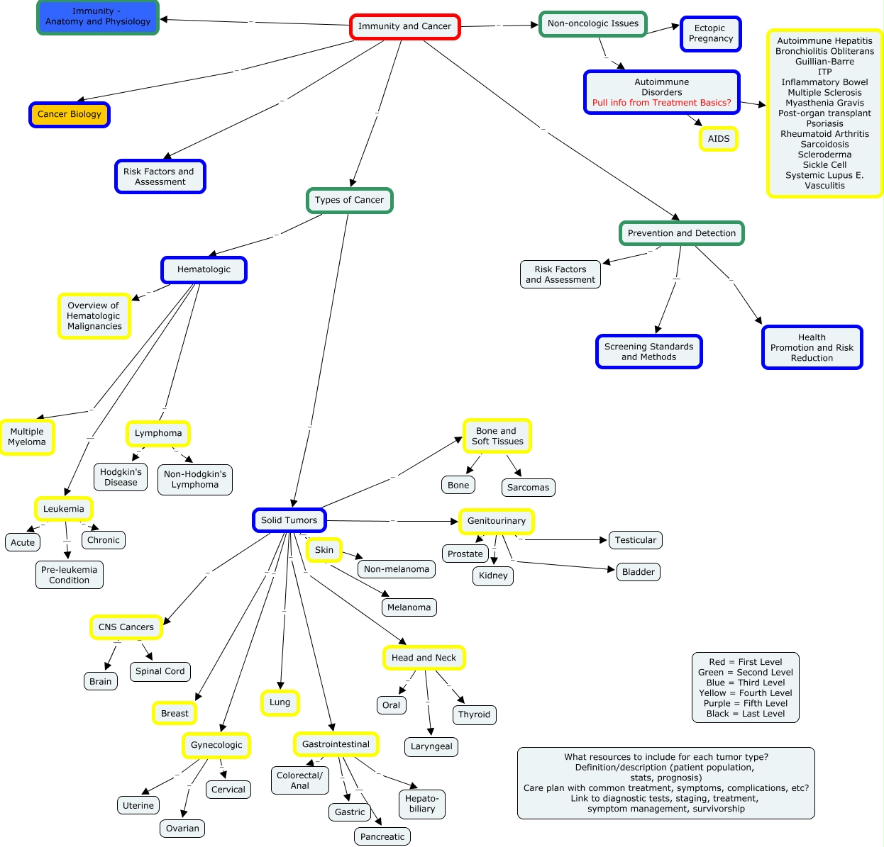 This Concept Map, created with IHMC CmapTools, has information related to: Cancer and immunity - masters, Gastrointestinal - Colorectal/ Anal, Genitourinary - Testicular, Types of Cancer - Hematologic, Head and Neck - Thyroid, Immunity and Cancer - Risk Factors and Assessment, Immunity and Cancer - Cancer Biology, Non-oncologic Issues - Autoimmune Disorders Pull info from Treatment Basics?, Gastrointestinal -- Pancreatic, Gynecologic - Cervical, Immunity and Cancer - Non-oncologic Issues, Solid Tumors - Gynecologic, Solid Tumors - Head and Neck, Solid Tumors - Bone and Soft Tissues, Hematologic - Overview of Hematologic Malignancies, Leukemia - Chronic, Solid Tumors - Breast, Solid Tumors - Lung, Non-oncologic Issues - Ectopic Pregnancy, Prevention and Detection - Risk Factors and Assessment, Genitourinary - Kidney