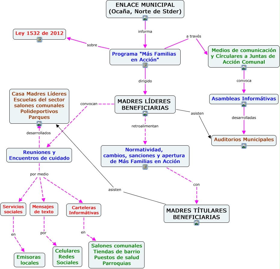 Este Cmap, tiene información relacionada con: Más familias en Acción, Reuniones y Encuentros de cuidado por medio Carteleras Informátivas, Programa "Más Familias en Acción" a través Medios de comunicación y Círculares a Juntas de Acción Comunal, Medios de comunicación y Círculares a Juntas de Acción Comunal convoca Asambleas Informátivas, ENLACE MUNICIPAL (Ocaña, Norte de Stder) informa Programa "Más Familias en Acción", Carteleras Informátivas en Salones comunales Tiendas de barrio Puestos de salud Parroquias, MADRES TÍTULARES BENEFICIARIAS asisten Casa Madres Líderes Escuelas del sector salones comunales Polideportivos Parques, MADRES LÍDERES BENEFICIARIAS convocan Reuniones y Encuentros de cuidado, Mensajes de texto por Celulares Redes Sociales, Reuniones y Encuentros de cuidado desarrollados Casa Madres Líderes Escuelas del sector salones comunales Polideportivos Parques, MADRES LÍDERES BENEFICIARIAS retroalimentan Normatividad, cambios, sanciones y apertura de Más Familias en Acción, Asambleas Informátivas desarrolladas Auditorios Municipales, Reuniones y Encuentros de cuidado por medio Servicios sociales, Programa "Más Familias en Acción" sobre Ley 1532 de 2012, MADRES LÍDERES BENEFICIARIAS asisten Auditorios Municipales, Programa "Más Familias en Acción" dirigido MADRES LÍDERES BENEFICIARIAS, Servicios sociales en Emisoras locales, Normatividad, cambios, sanciones y apertura de Más Familias en Acción con MADRES TÍTULARES BENEFICIARIAS, Reuniones y Encuentros de cuidado por medio Mensajes de texto