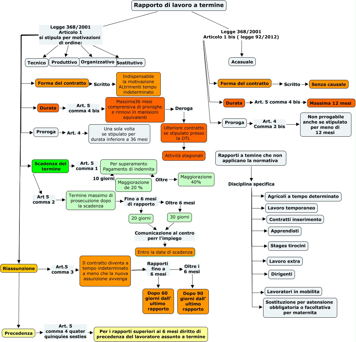 Questa Cmap, creata con IHMC CmapTools, contiene informazioni relative a: Rapporto di lavoro a termine, Rapporti a temine che non applicano la normativa Disciplina specifica Apprendisti, Riassunzione Art.5 comma 3 Il contratto diventa a tempo indeterminato a meno che la nuova assunzione avvenga, Per superamento Pagamento di indennita 10 giorni Maggiorazione de 20 %, Proroga Art. 4 Una sola volta se stipulato per durata inferiore a 36 mesi, Rapporti a temine che non applicano la normativa Disciplina specifica Lavoro extra, Massima36 mesi comprensiva di proroghe e rinnovi in manisioni equivalenti Deroga Attività stagionali, Durata Art. 5 comma 4 bis Massima36 mesi comprensiva di proroghe e rinnovi in manisioni equivalenti, Il contratto diventa a tempo indeterminato a meno che la nuova assunzione avvenga Oltre i 6 mesi Dopo 90 giorni dall' ultimo rapporto, Rapporto di lavoro a termine Legge 368/2001 Articolo 1 bis ( legge 92/2012) Acasuale, Scadenza del termine Art. 5 comma 1 Per superamento Pagamento di indennita, Per superamento Pagamento di indennita Oltre Maggiorazione 40%, Rapporto di lavoro a termine Legge 368/2001 Articolo 1 si stipula per motivazioni di ordine: Scadenza del termine, 20 giorni Comunicazione al centro perr l'impiego Entro la data di scadenza, Scadenza del termine Art 5 comma 2 Termine massimo di prosecuzione dopo la scadenza, Precedenza Art. 5 comma 4 quater quinquies sesties Per i rapporti superiori ai 6 mesi diritto di precedenza del lavoratore assunto a termine, Rapporto di lavoro a termine Legge 368/2001 Articolo 1 bis ( legge 92/2012) Durata, Rapporto di lavoro a termine Legge 368/2001 Articolo 1 bis ( legge 92/2012) Proroga, Il contratto diventa a tempo indeterminato a meno che la nuova assunzione avvenga Rapporti fino a 6 mesi Dopo 60 giorni dall' ultimo rapporto, Termine massimo di prosecuzione dopo la scadenza Oltre 6 mesi 30 giorni, Rapporti a temine che non applicano la normativa Disciplina specifica Stages tirocini