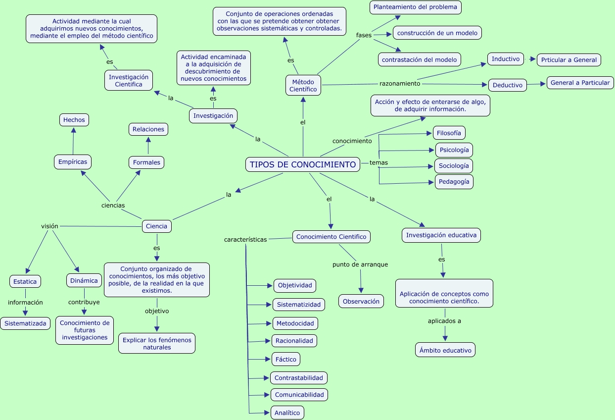 Este Cmap, tiene información relacionada con: Tipos de Conocimiento, Investigación Cientifica es Actividad mediante la cual adquirimos nuevos conocimientos, mediante el empleo del método científico, TIPOS DE CONOCIMIENTO conocimiento Acción y efecto de enterarse de algo, de adquirir información., Ciencia visión Estatica, Conocimiento Cientifico características Sistematizidad, Método Científico razonamiento Inductivo, Empíricas ???? Hechos, Ciencia ciencias Empíricas, Investigación educativa es Aplicación de conceptos como conocimiento científico., Conocimiento Cientifico características Contrastabilidad, Aplicación de conceptos como conocimiento científico. aplicados a Ámbito educativo, TIPOS DE CONOCIMIENTO el Conocimiento Cientifico, Método Científico fases Planteamiento del problema, TIPOS DE CONOCIMIENTO el Método Científico, Conocimiento Cientifico características Comunicabilidad, Conocimiento Cientifico características Analítico, TIPOS DE CONOCIMIENTO la Ciencia, Conocimiento Cientifico características Objetividad, Conocimiento Cientifico características Fáctico, Conjunto organizado de conocimientos, los más objetivo posible, de la realidad en la que existimos. objetivo Explicar los fenómenos naturales, Deductivo General a Particular