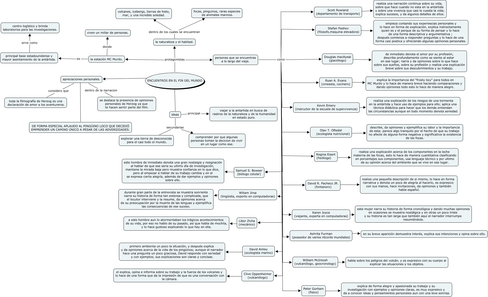 Este Cmap, tiene información relacionada con: encuentros en el fin del mundo, personas que se encuentras a lo largo del viaje. como Wiliam Jirsa (lingüista, experto en computadoras), personas que se encuentras a lo largo del viaje. como Scott Rowland (departamento de transporte), Regina Eisert (fisióloga) ???? realiza una explicación acerca de los componentes en la leche materna de las focas, esto lo hace de manera cuantitativa clasificando en porcentajes sus componentes, usa lenguaje técnico y por ultimo da su opinión acerca del ambiente que se vive en ese lugar., Libor Zicha (mecánico) ???? a este hombre aun lo atormentaban los trágicos acontecimientos de su vida, por eso no hablo de su pasado, así que habla de mochila, y lo hace gustoso explicando lo que hay en ella., la naturaleza y el habitad. dentro de los cuales se encuentran volcanes, icebergs, tierras de hielo, mar, y una increible soledad., personas que se encuentras a lo largo del viaje. como Ryan A. Evans (cineasta, cocinero), Douglas macAyeal (glaciólogo) ???? de inmediato denota el amor por su profesión, describe profundamente como se siente al estar en ese lugar; narra y da opiniones sobre lo que hace sobre sus sueños, sobre su profesión y realiza una explicación breve sobre sus descubrimientos y su trabajo., Olav T. Oftedal (ecologista nutricional) ???? describe, da opiniones y ejemplifica su labor y la importancia de esta; parece algo tranquilo por el hecho de que su trabajo no afecte de alguna forma negativa y significativa la existencia de las focas., Scott Rowland (departamento de transporte) ???? realiza una narración continua sobre su vida, sobre que hace cuando no esta en la antártida y sobre una vivencia que casi le cuesta la vida; explica sucesos, y da algunos detalles de ellos., la naturaleza y el habitad. dentro de los cuales se encuentran focas, pinguinos, raras especies de animales marinos., ideas secundarias explorar una tierra de desconocida para el casi todo el mundo., personas que se encuentras a lo largo del viaje. como William McIntosh (vulcanólogo, geocronologo), personas que se encuentras a lo largo del viaje. como Libor Zicha (mecánico), ideas secundarias comprender por que algunas personas toman la decicion de vivir en un lugar como ese., personas que se encuentras a lo largo del viaje. como David R. Pacheco JR. (fontanero), personas que se encuentras a lo largo del viaje. como Ashrita Furman (poseedor de varios récords mundiales), ENCUENTROS EN EL FIN DEL MUNDO protagonistas personas que se encuentras a lo largo del viaje., personas que se encuentras a lo largo del viaje. como Stefan Pashov (filosofo,maquina elevadora), personas que se encuentras a lo largo del viaje. como Kevin Emery (instructor de la escuela de supervivencia), Clive Oppenheimer (vulcanólogo) ???? el explica, opina e informa sobre su trabajo y la fuerza de los volcanes y lo hace de una forma que da la impresión de que es una conversación con la cámara.