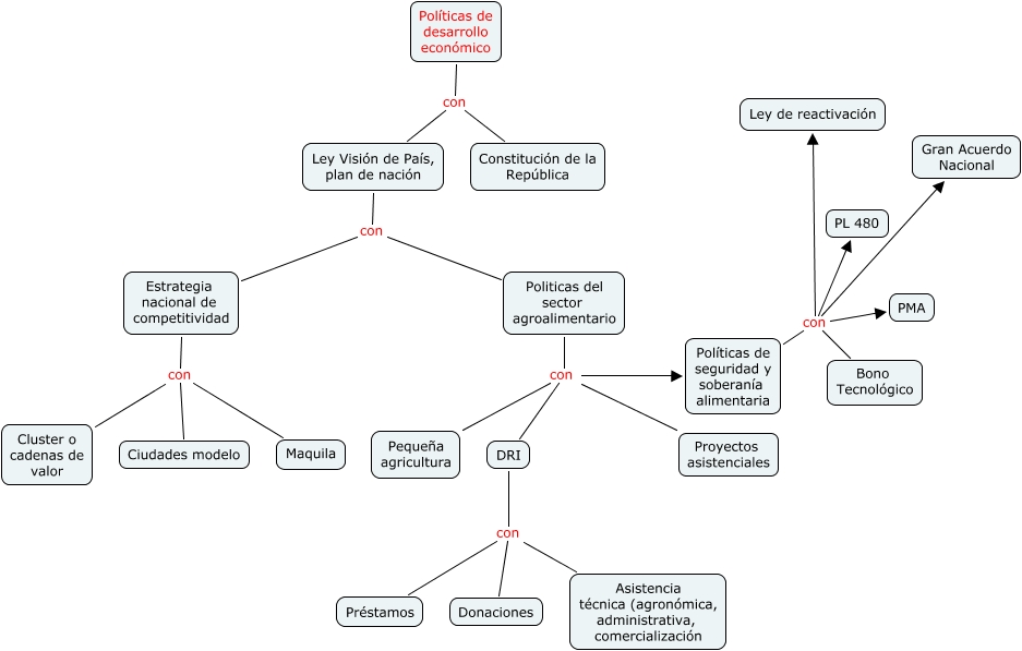 Este Cmap, tiene información relacionada con: Políticas de desarrollo Investigación DHA, Políticas de seguridad y soberanía alimentaria con Ley de reactivación, Ley Visión de País, plan de nación con Estrategia nacional de competitividad, Políticas de seguridad y soberanía alimentaria con PL 480, Políticas de desarrollo económico con Constitución de la República, Políticas de desarrollo económico con Ley Visión de País, plan de nación, Estrategia nacional de competitividad con Ciudades modelo, Politicas del sector agroalimentario con DRI, Políticas de seguridad y soberanía alimentaria con PMA, DRI con Asistencia técnica (agronómica, administrativa, comercialización, Políticas de seguridad y soberanía alimentaria con Gran Acuerdo Nacional, Estrategia nacional de competitividad con Cluster o cadenas de valor, Políticas de seguridad y soberanía alimentaria con Bono Tecnológico, Politicas del sector agroalimentario con Pequeña agricultura, DRI con Donaciones, Politicas del sector agroalimentario con Proyectos asistenciales, Politicas del sector agroalimentario con Políticas de seguridad y soberanía alimentaria, Ley Visión de País, plan de nación con Politicas del sector agroalimentario, Estrategia nacional de competitividad con Maquila, DRI con Préstamos