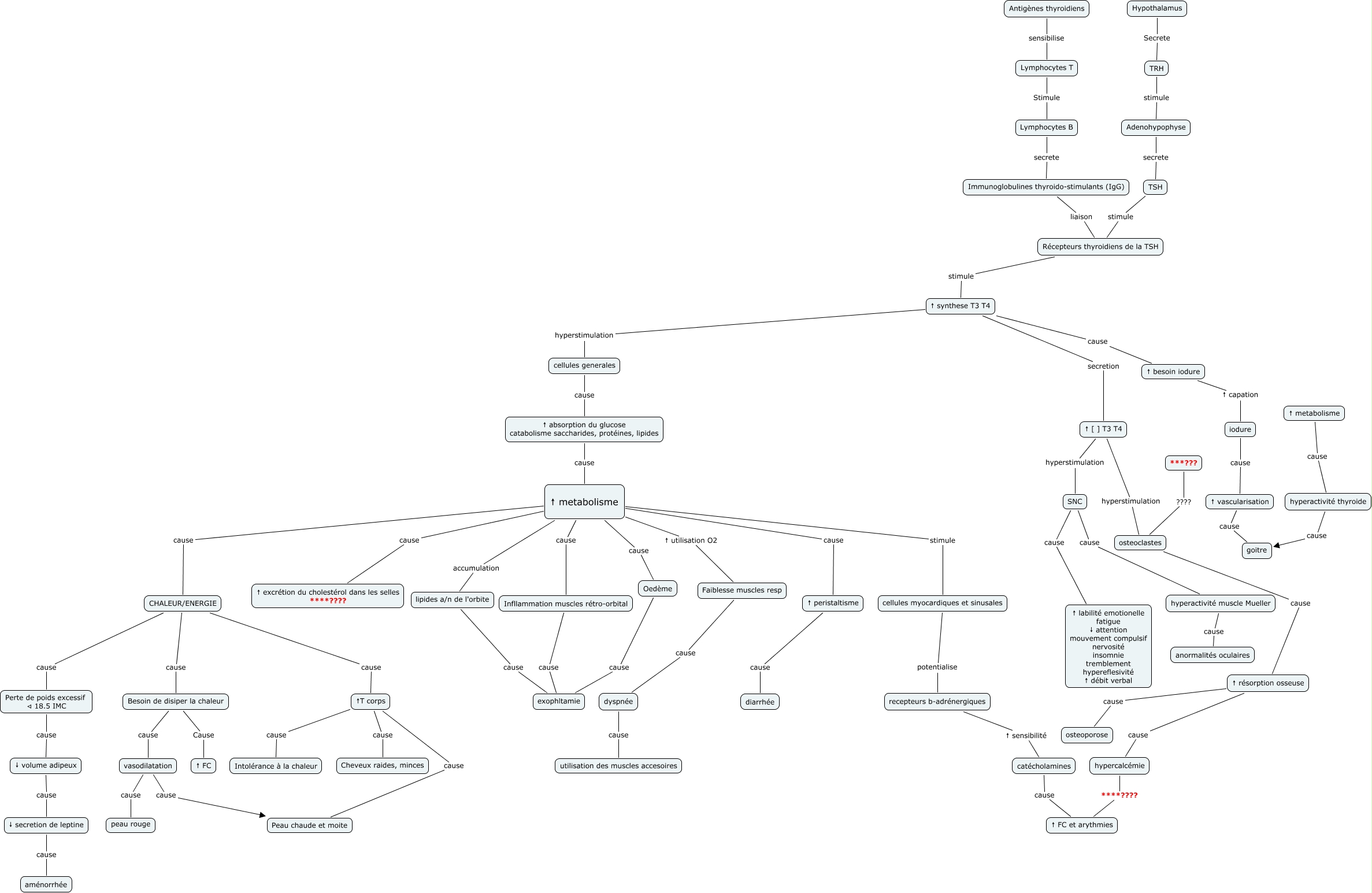 This Concept Map, created with IHMC CmapTools, has information related to: Maladie de Graves, Oedème cause exophltamie, ↑ metabolisme cause hyperactivité thyroide, Immunoglobulines thyroido-stimulants (IgG) liaison Récepteurs thyroidiens de la TSH, hypercalcémie ****???? ↑ FC et arythmies, ↑ vascularisation cause goitre, ↑T corps cause Intolérance à la chaleur, ↑ besoin iodure ↑ capation iodure, iodure cause ↑ vascularisation, Récepteurs thyroidiens de la TSH stimule ↑ synthese T3 T4, SNC cause hyperactivité muscle Mueller, ↑T corps cause Cheveux raides, minces, Hypothalamus Secrete TRH, ↑ metabolisme accumulation lipides a/n de l'orbite, ↑ synthese T3 T4 hyperstimulation cellules generales, ↑ résorption osseuse cause hypercalcémie, Lymphocytes T Stimule Lymphocytes B, vasodilatation cause Peau chaude et moite, ↑ metabolisme cause Infllammation muscles rétro-orbital, ↑ absorption du glucose catabolisme saccharides, protéines, lipides cause ↑ metabolisme, ↑ résorption osseuse cause osteoporose