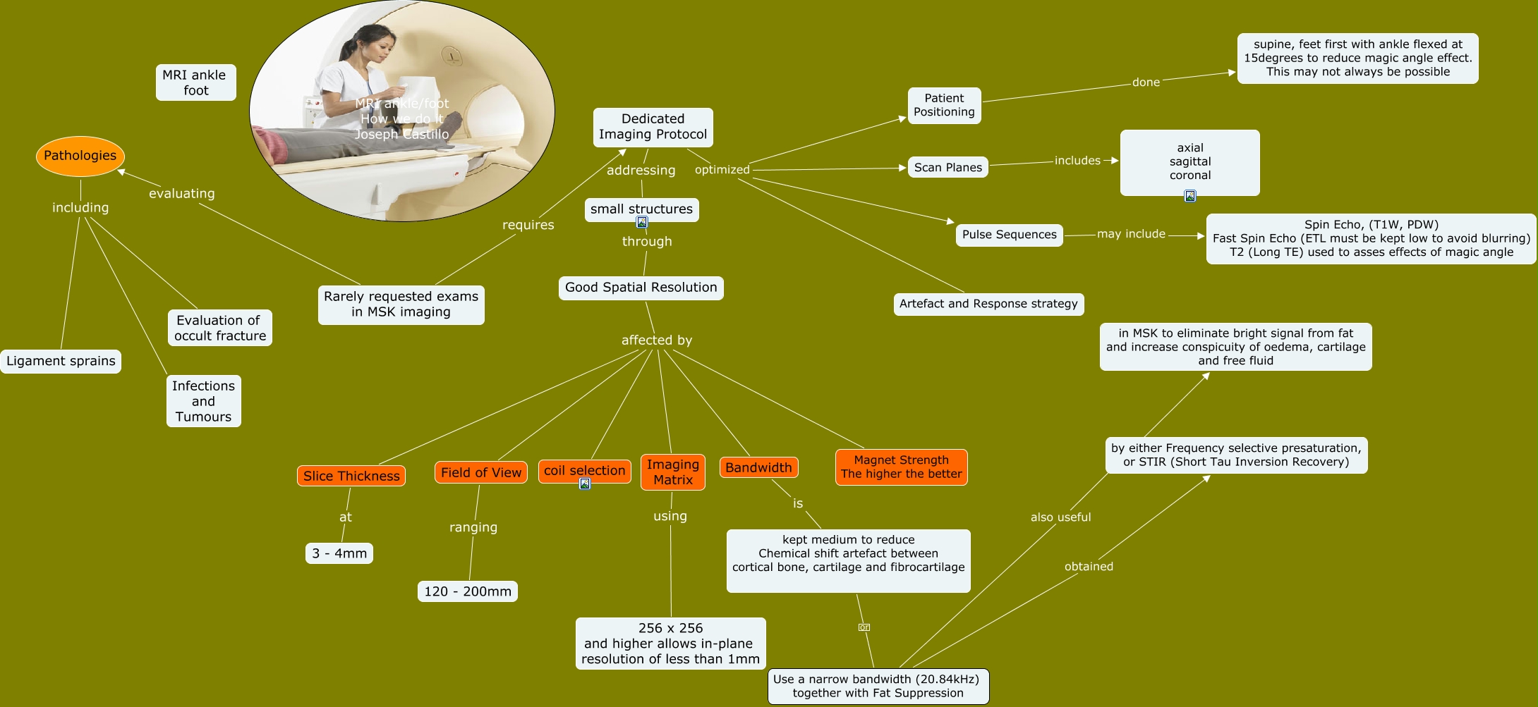 This Concept Map, created with IHMC CmapTools, has information related to: MRI ankle How we do it, Slice Thickness at 3 - 4mm, Dedicated Imaging Protocol optimized Scan Planes, Pathologies including Evaluation of occult fracture, small structures through Good Spatial Resolution, Bandwidth is kept medium to reduce Chemical shift artefact between cortical bone, cartilage and fibrocartilage, Pulse Sequences may include Spin Echo, (T1W, PDW) Fast Spin Echo (ETL must be kept low to avoid blurring) T2 (Long TE) used to asses effects of magic angle, Good Spatial Resolution affected by Field of View, Good Spatial Resolution affected by coil selection, Rarely requested exams in MSK imaging evaluating Pathologies, Good Spatial Resolution affected by Bandwidth, Imaging Matrix using 256 x 256 and higher allows in-plane resolution of less than 1mm, Use a narrow bandwidth (20.84kHz) together with Fat Suppression also useful in MSK to eliminate bright signal from fat and increase conspicuity of oedema, cartilage and free fluid, Pathologies including Infections and Tumours, Good Spatial Resolution affected by Magnet Strength The higher the better, Good Spatial Resolution affected by Imaging Matrix, Use a narrow bandwidth (20.84kHz) together with Fat Suppression obtained by either Frequency selective presaturation, or STIR (Short Tau Inversion Recovery), Rarely requested exams in MSK imaging requires Dedicated Imaging Protocol, Dedicated Imaging Protocol optimized Patient Positioning, Scan Planes includes axial sagittal coronal, Good Spatial Resolution affected by Slice Thickness