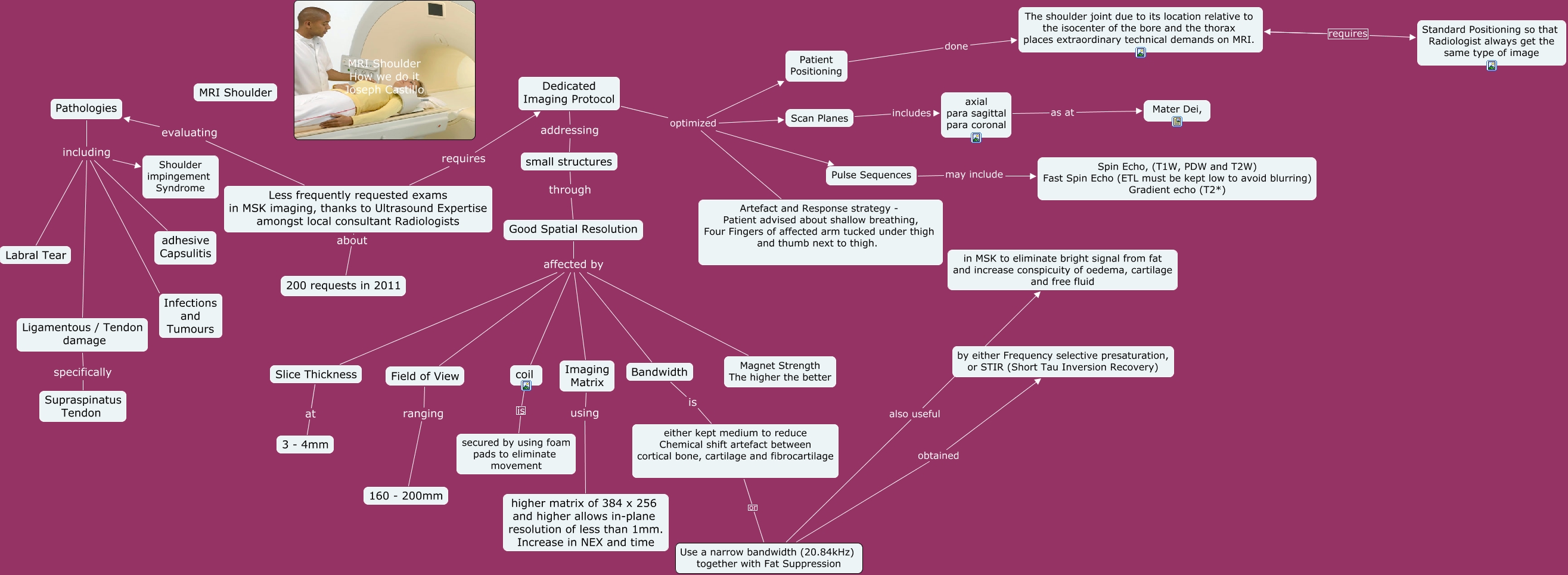 This Concept Map, created with IHMC CmapTools, has information related to: MRI Shoulder How we do it, Slice Thickness at 3 - 4mm, Imaging Matrix using higher matrix of 384 x 256 and higher allows in-plane resolution of less than 1mm. Increase in NEX and time, Dedicated Imaging Protocol optimized Scan Planes, Good Spatial Resolution affected by Slice Thickness, Good Spatial Resolution affected by Imaging Matrix, axial para sagittal para coronal as at Mater Dei,, Patient Positioning done The shoulder joint due to its location relative to the isocenter of the bore and the thorax places extraordinary technical demands on MRI., Pathologies including adhesive Capsulitis, Bandwidth is either kept medium to reduce Chemical shift artefact between cortical bone, cartilage and fibrocartilage, Use a narrow bandwidth (20.84kHz) together with Fat Suppression obtained by either Frequency selective presaturation, or STIR (Short Tau Inversion Recovery), The shoulder joint due to its location relative to the isocenter of the bore and the thorax places extraordinary technical demands on MRI. requires Standard Positioning so that Radiologist always get the same type of image, Good Spatial Resolution affected by coil, Pathologies including Ligamentous / Tendon damage, small structures through Good Spatial Resolution, Ligamentous / Tendon damage specifically Supraspinatus Tendon, Dedicated Imaging Protocol optimized Artefact and Response strategy - Patient advised about shallow breathing, Four Fingers of affected arm tucked under thigh and thumb next to thigh., Use a narrow bandwidth (20.84kHz) together with Fat Suppression also useful in MSK to eliminate bright signal from fat and increase conspicuity of oedema, cartilage and free fluid, Less frequently requested exams in MSK imaging, thanks to Ultrasound Expertise amongst local consultant Radiologists evaluating Pathologies, Pulse Sequences may include Spin Echo, (T1W, PDW and T2W) Fast Spin Echo (ETL must be kept low to avoid blurring) Gradient echo (T2*), Field of View ranging 160 - 200mm
