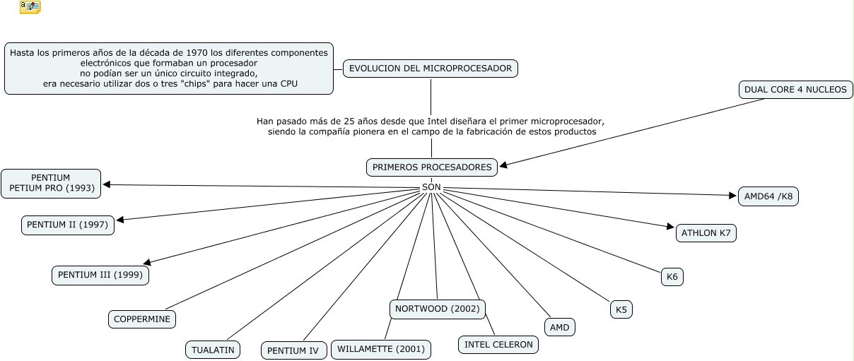 Este Cmap, tiene información relacionada con: EVOLUCION DEL PROCESADOR, EVOLUCION DEL MICROPROCESADOR Han pasado más de 25 años desde que Intel diseñara el primer microprocesador, siendo la compañía pionera en el campo de la fabricación de estos productos PRIMEROS PROCESADORES, PRIMEROS PROCESADORES SON ATHLON K7, DUAL CORE 4 NUCLEOS ???? PRIMEROS PROCESADORES, PRIMEROS PROCESADORES SON COPPERMINE, PRIMEROS PROCESADORES SON INTEL CELERON, PRIMEROS PROCESADORES SON PENTIUM PETIUM PRO (1993), PRIMEROS PROCESADORES SON K5, PRIMEROS PROCESADORES SON AMD64 /K8, EVOLUCION DEL MICROPROCESADOR ???? Hasta los primeros años de la década de 1970 los diferentes componentes electrónicos que formaban un procesador no podían ser un único circuito integrado, era necesario utilizar dos o tres "chips" para hacer una CPU, PRIMEROS PROCESADORES SON WILLAMETTE (2001), PRIMEROS PROCESADORES SON TUALATIN, PRIMEROS PROCESADORES SON PENTIUM III (1999), PRIMEROS PROCESADORES SON PENTIUM II (1997), PRIMEROS PROCESADORES SON NORTWOOD (2002), PRIMEROS PROCESADORES SON AMD, PRIMEROS PROCESADORES SON K6, PRIMEROS PROCESADORES SON PENTIUM IV