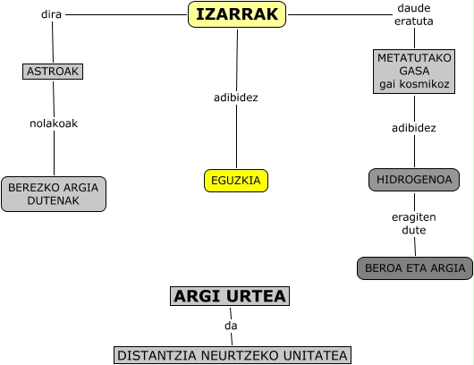 IHMC CmapTools-ekin sortu den kontzeptu-mapa honek honi buruzko informazioa du: TXANELA 1 IZARRAK, IZARRAK dira ASTROAK, IZARRAK daude eratuta METATUTAKO GASA gai kosmikoz, ASTROAK nolakoak BEREZKO ARGIA DUTENAK, ARGI URTEA da DISTANTZIA NEURTZEKO UNITATEA, IZARRAK adibidez EGUZKIA, METATUTAKO GASA gai kosmikoz adibidez HIDROGENOA, HIDROGENOA eragiten dute BEROA ETA ARGIA