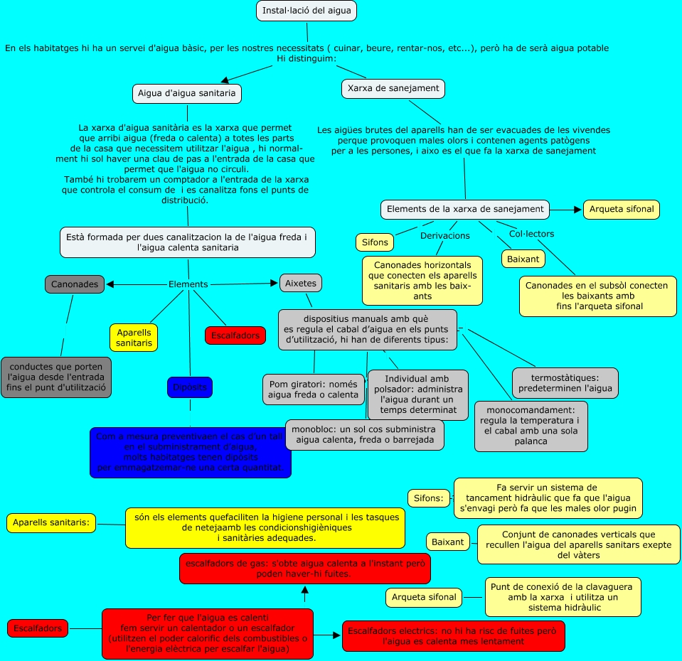 Aquest mapa conceptual conté informació relacionada amb: Tecnologia, Està formada per dues canalitzacion la de l'aigua freda i l'aigua calenta sanitaria Elements Dipòsits, Escalfadors Per fer que l'aigua es calenti fem servir un calentador o un escalfador (utilitzen el poder calorific dels combustibles o l'energia elèctrica per escalfar l'aigua), Està formada per dues canalitzacion la de l'aigua freda i l'aigua calenta sanitaria Elements Escalfadors, Elements de la xarxa de sanejament Derivacions Canonades horizontals que conecten els aparells sanitaris amb les baix- ants, Està formada per dues canalitzacion la de l'aigua freda i l'aigua calenta sanitaria Elements Canonades, dispositius manuals amb què es regula el cabal d’aigua en els punts d’utilització, hi han de diferents tipus: ???? monobloc: un sol cos subministra aigua calenta, freda o barrejada, Arqueta sifonal ???? Punt de conexió de la clavaguera amb la xarxa i utilitza un sistema hidràulic, Està formada per dues canalitzacion la de l'aigua freda i l'aigua calenta sanitaria Elements Aixetes, dispositius manuals amb què es regula el cabal d’aigua en els punts d’utilització, hi han de diferents tipus: termostàtiques: predeterminen l'aigua, dispositius manuals amb què es regula el cabal d’aigua en els punts d’utilització, hi han de diferents tipus: Individual amb polsador: administra l'aigua durant un temps determinat, Dipòsits Com a mesura preventivaen el cas d’un tall en el subministrament d’aigua, molts habitatges tenen dipòsits per emmagatzemar-ne una certa quantitat., Està formada per dues canalitzacion la de l'aigua freda i l'aigua calenta sanitaria Elements Aparells sanitaris, Per fer que l'aigua es calenti fem servir un calentador o un escalfador (utilitzen el poder calorific dels combustibles o l'energia elèctrica per escalfar l'aigua) escalfadors de gas: s'obte aigua calenta a l'instant però poden haver-hi fuites., Elements de la xarxa de sanejament Baixant, Sifons: ???? Fa servir un sistema de tancament hidràulic que fa que l'aigua s'envagi però fa que les males olor pugin, Instal·lació del aigua En els habitatges hi ha un servei d'aigua bàsic, per les nostres necessitats ( cuinar, beure, rentar-nos, etc...), però ha de serà aigua potable Hi distinguim: Xarxa de sanejament, dispositius manuals amb què es regula el cabal d’aigua en els punts d’utilització, hi han de diferents tipus: monocomandament: regula la temperatura i el cabal amb una sola palanca, Xarxa de sanejament Les aigües brutes del aparells han de ser evacuades de les vivendes perque provoquen males olors i contenen agents patògens per a les persones, i aixo es el que fa la xarxa de sanejament Elements de la xarxa de sanejament, Elements de la xarxa de sanejament Sifons, Instal·lació del aigua En els habitatges hi ha un servei d'aigua bàsic, per les nostres necessitats ( cuinar, beure, rentar-nos, etc...), però ha de serà aigua potable Hi distinguim: Aigua d'aigua sanitaria