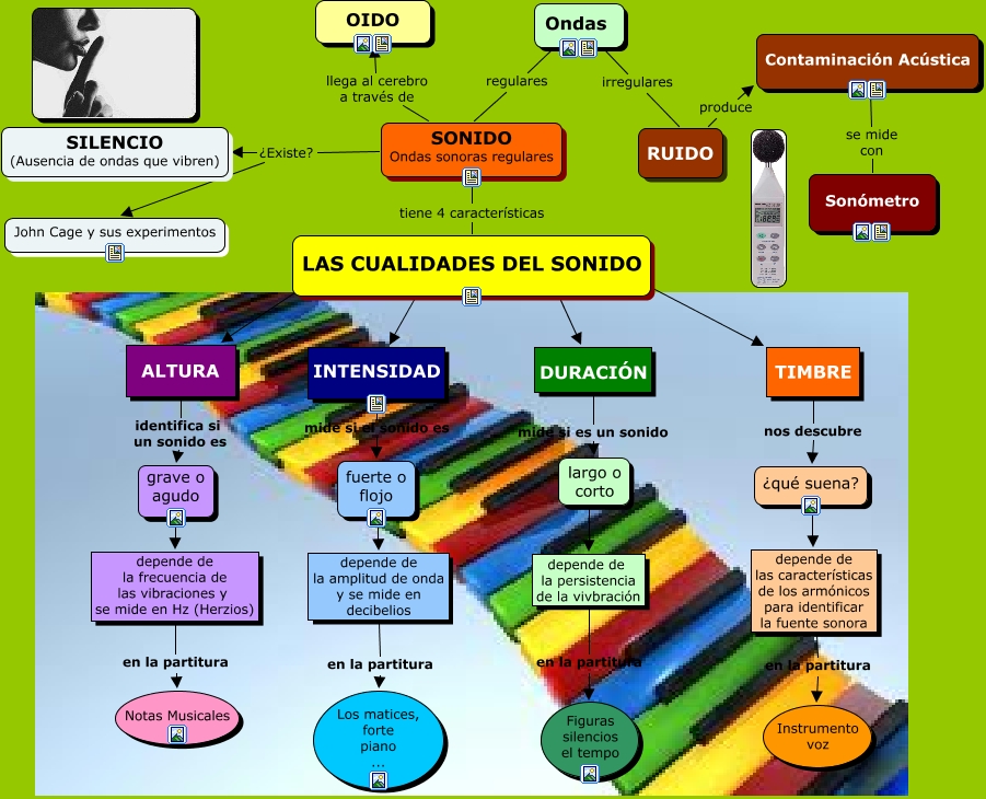 Este Cmap, tiene información relacionada con: cualidades del sonido, depende de las características de los armónicos para identificar la fuente sonora en la partitura Instrumento voz, INTENSIDAD mide si el sonido es fuerte o flojo, largo o corto ???? depende de la persistencia de la vivbración, ¿qué suena? ???? depende de las características de los armónicos para identificar la fuente sonora, SONIDO Ondas sonoras regulares ¿Existe? SILENCIO (Ausencia de ondas que vibren), LAS CUALIDADES DEL SONIDO TIMBRE, LAS CUALIDADES DEL SONIDO INTENSIDAD, SONIDO Ondas sonoras regulares ¿Existe? John Cage y sus experimentos, depende de la persistencia de la vivbración en la partitura Figuras silencios el tempo, Contaminación Acústica se mide con Sonómetro, depende de la frecuencia de las vibraciones y se mide en Hz (Herzios) en la partitura Notas Musicales, SONIDO Ondas sonoras regulares llega al cerebro a través de OIDO, Ondas irregulares RUIDO, depende de la amplitud de onda y se mide en decibelios en la partitura Los matices, forte piano ..., TIMBRE nos descubre ¿qué suena?, grave o agudo ???? depende de la frecuencia de las vibraciones y se mide en Hz (Herzios), LAS CUALIDADES DEL SONIDO DURACIÓN, RUIDO produce Contaminación Acústica, LAS CUALIDADES DEL SONIDO ALTURA, SONIDO Ondas sonoras regulares tiene 4 características LAS CUALIDADES DEL SONIDO