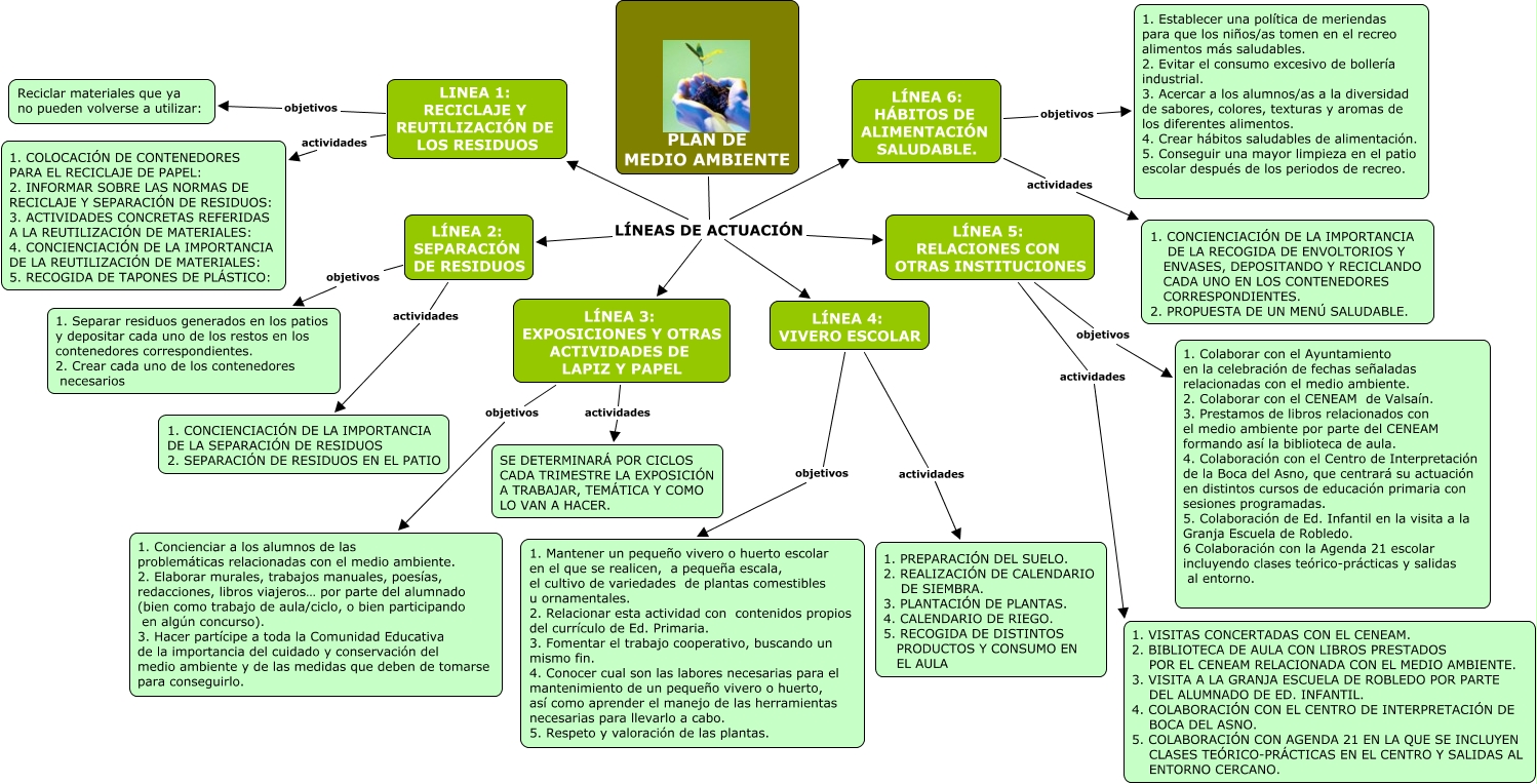 Este Cmap, tiene información relacionada con: Ed_ambiental, LÍNEA 6: HÁBITOS DE ALIMENTACIÓN SALUDABLE. objetivos 1. Establecer una política de meriendas para que los niños/as tomen en el recreo alimentos más saludables. 2. Evitar el consumo excesivo de bollería industrial. 3. Acercar a los alumnos/as a la diversidad de sabores, colores, texturas y aromas de los diferentes alimentos. 4. Crear hábitos saludables de alimentación. 5. Conseguir una mayor limpieza en el patio escolar después de los periodos de recreo., LÍNEA 3: EXPOSICIONES Y OTRAS ACTIVIDADES DE LAPIZ Y PAPEL actividades SE DETERMINARÁ POR CICLOS CADA TRIMESTRE LA EXPOSICIÓN A TRABAJAR, TEMÁTICA Y COMO LO VAN A HACER., LÍNEA 4: VIVERO ESCOLAR actividades 1. PREPARACIÓN DEL SUELO. 2. REALIZACIÓN DE CALENDARIO DE SIEMBRA. 3. PLANTACIÓN DE PLANTAS. 4. CALENDARIO DE RIEGO. 5. RECOGIDA DE DISTINTOS PRODUCTOS Y CONSUMO EN EL AULA, LÍNEA 6: HÁBITOS DE ALIMENTACIÓN SALUDABLE. actividades 1. CONCIENCIACIÓN DE LA IMPORTANCIA DE LA RECOGIDA DE ENVOLTORIOS Y ENVASES, DEPOSITANDO Y RECICLANDO CADA UNO EN LOS CONTENEDORES CORRESPONDIENTES. 2. PROPUESTA DE UN MENÚ SALUDABLE., LINEA 1: RECICLAJE Y REUTILIZACIÓN DE LOS RESIDUOS objetivos Reciclar materiales que ya no pueden volverse a utilizar:, LÍNEA 5: RELACIONES CON OTRAS INSTITUCIONES objetivos 1. Colaborar con el Ayuntamiento en la celebración de fechas señaladas relacionadas con el medio ambiente. 2. Colaborar con el CENEAM de Valsaín. 3. Prestamos de libros relacionados con el medio ambiente por parte del CENEAM formando así la biblioteca de aula. 4. Colaboración con el Centro de Interpretación de la Boca del Asno, que centrará su actuación en distintos cursos de educación primaria con sesiones programadas. 5. Colaboración de Ed. Infantil en la visita a la Granja Escuela de Robledo. 6 Colaboración con la Agenda 21 escolar incluyendo clases teórico-prácticas y salidas al entorno., PLAN DE MEDIO AMBIENTE LÍNEAS DE ACTUACIÓN LÍNEA 3: EXPOSICIONES Y OTRAS ACTIVIDADES DE LAPIZ Y PAPEL, PLAN DE MEDIO AMBIENTE LÍNEAS DE ACTUACIÓN LINEA 1: RECICLAJE Y REUTILIZACIÓN DE LOS RESIDUOS, LÍNEA 4: VIVERO ESCOLAR objetivos 1. Mantener un pequeño vivero o huerto escolar en el que se realicen, a pequeña escala, el cultivo de variedades de plantas comestibles u ornamentales. 2. Relacionar esta actividad con contenidos propios del currículo de Ed. Primaria. 3. Fomentar el trabajo cooperativo, buscando un mismo fin. 4. Conocer cual son las labores necesarias para el mantenimiento de un pequeño vivero o huerto, así como aprender el manejo de las herramientas necesarias para llevarlo a cabo. 5. Respeto y valoración de las plantas., PLAN DE MEDIO AMBIENTE LÍNEAS DE ACTUACIÓN LÍNEA 6: HÁBITOS DE ALIMENTACIÓN SALUDABLE., PLAN DE MEDIO AMBIENTE LÍNEAS DE ACTUACIÓN LÍNEA 4: VIVERO ESCOLAR, LÍNEA 3: EXPOSICIONES Y OTRAS ACTIVIDADES DE LAPIZ Y PAPEL objetivos 1. Concienciar a los alumnos de las problemáticas relacionadas con el medio ambiente. 2. Elaborar murales, trabajos manuales, poesías, redacciones, libros viajeros… por parte del alumnado (bien como trabajo de aula/ciclo, o bien participando en algún concurso). 3. Hacer partícipe a toda la Comunidad Educativa de la importancia del cuidado y conservación del medio ambiente y de las medidas que deben de tomarse para conseguirlo., PLAN DE MEDIO AMBIENTE LÍNEAS DE ACTUACIÓN LÍNEA 5: RELACIONES CON OTRAS INSTITUCIONES, LÍNEA 2: SEPARACIÓN DE RESIDUOS actividades 1. CONCIENCIACIÓN DE LA IMPORTANCIA DE LA SEPARACIÓN DE RESIDUOS 2. SEPARACIÓN DE RESIDUOS EN EL PATIO, LÍNEA 2: SEPARACIÓN DE RESIDUOS objetivos 1. Separar residuos generados en los patios y depositar cada uno de los restos en los contenedores correspondientes. 2. Crear cada uno de los contenedores necesarios, PLAN DE MEDIO AMBIENTE LÍNEAS DE ACTUACIÓN LÍNEA 2: SEPARACIÓN DE RESIDUOS, LÍNEA 5: RELACIONES CON OTRAS INSTITUCIONES actividades 1. VISITAS CONCERTADAS CON EL CENEAM. 2. BIBLIOTECA DE AULA CON LIBROS PRESTADOS POR EL CENEAM RELACIONADA CON EL MEDIO AMBIENTE. 3. VISITA A LA GRANJA ESCUELA DE ROBLEDO POR PARTE DEL ALUMNADO DE ED. INFANTIL. 4. COLABORACIÓN CON EL CENTRO DE INTERPRETACIÓN DE BOCA DEL ASNO. 5. COLABORACIÓN CON AGENDA 21 EN LA QUE SE INCLUYEN CLASES TEÓRICO-PRÁCTICAS EN EL CENTRO Y SALIDAS AL ENTORNO CERCANO., LINEA 1: RECICLAJE Y REUTILIZACIÓN DE LOS RESIDUOS actividades 1. COLOCACIÓN DE CONTENEDORES PARA EL RECICLAJE DE PAPEL: 2. INFORMAR SOBRE LAS NORMAS DE RECICLAJE Y SEPARACIÓN DE RESIDUOS: 3. ACTIVIDADES CONCRETAS REFERIDAS A LA REUTILIZACIÓN DE MATERIALES: 4. CONCIENCIACIÓN DE LA IMPORTANCIA DE LA REUTILIZACIÓN DE MATERIALES: 5. RECOGIDA DE TAPONES DE PLÁSTICO: