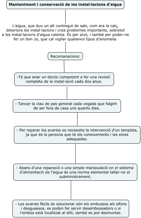Aquest mapa conceptual conté informació relacionada amb: Manteniment i conservació de les instal·lacions d'aigua, Recomanacions: ???? -Té que anar un tècnic competent a fer una revisió completa de la instal·lació cada dos anys., - Per reparar les avaries es necessita la intervenció d’un lampista, ja que és la persona que té els coneixements i les eines adequades. ???? - Abans d’una reparació o una simple manipulació en el sistema d’alimentació de l’aigua és una norma elemental tallar-ne el subministrament., - Tancar la clau de pas general cada vegada que hàgim de ser fora de casa uns quants dies. ???? - Per reparar les avaries es necessita la intervenció d’un lampista, ja que és la persona que té els coneixements i les eines adequades., Manteniment i conservació de les instal·lacions d’aigua L’aigua, que duu un alt contingut de sals, com ara la calç, deteriora les instal·lacions i crea problemes importants, sobretot a les instal·lacions d’aigua calenta. És per això, i també per poder-ne fer un bon ús, que cal vigilar qualsevol tipus d’anomalia. Recomanacions:, - Abans d’una reparació o una simple manipulació en el sistema d’alimentació de l’aigua és una norma elemental tallar-ne el subministrament. ???? - Les avaries fàcils de solucionar són els embussos als sifons i desguassos, es poden fer servir desembossadors o si l’embús està localitzat al sifó, també es pot desmuntar., -Té que anar un tècnic competent a fer una revisió completa de la instal·lació cada dos anys. ???? - Tancar la clau de pas general cada vegada que hàgim de ser fora de casa uns quants dies.