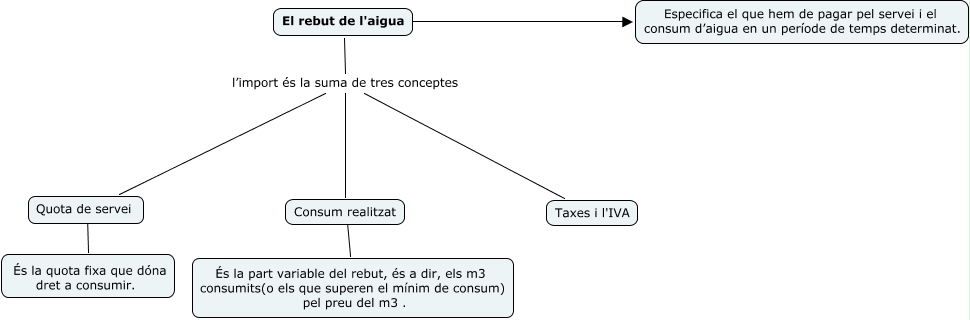 Aquest mapa conceptual conté informació relacionada amb: El rebut de l'aigua, El rebut de l'aigua l’import és la suma de tres conceptes Consum realitzat, El rebut de l'aigua l’import és la suma de tres conceptes Taxes i l'IVA, El rebut de l'aigua l’import és la suma de tres conceptes Quota de servei, Consum realitzat ???? És la part variable del rebut, és a dir, els m3 consumits(o els que superen el mínim de consum) pel preu del m3 ., El rebut de l'aigua ???? Especifica el que hem de pagar pel servei i el consum d’aigua en un període de temps determinat., Quota de servei ???? És la quota fixa que dóna dret a consumir.