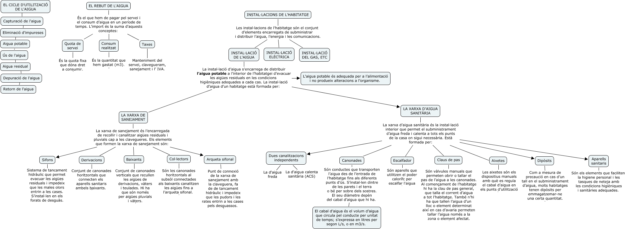 Este Cmap, tiene información relacionada con: Tecnologia 1, INSTAL·LACIÓ DE L'AIGUA La instal·lació d’aigua s'encarrega de distribuir l’aigua potable a l’interior de l’habitatgei d’evacuar les aigües residuals en les condicions higièniques adequades a cada cas. La instal·lació d’aigua d’un habitatge està formada per: LA XARXA DE SANEJAMENT, LA XARXA DE SANEJAMENT La xarxa de sanejament és l’encarregada de recollir i canalitzar aigües residuals i pluvials cap a les clavegueres. Els elements que formen la xarxa de sanejament són: Sifons, EL REBUT DE L'AIGUA És el que hem de pagar pel servei i el consum d’aigua en un període de temps. L’import és la suma d'aquests conceptes: Taxes, LA XARXA DE SANEJAMENT La xarxa de sanejament és l’encarregada de recollir i canalitzar aigües residuals i pluvials cap a les clavegueres. Els elements que formen la xarxa de sanejament són: Arqueta sifonal, LA XARXA D'AIGUA SANITÀRIA La xarxa d’aigua sanitària és la instal·lació interior que permet el subministrament d’aigua freda i calenta a tots els punts de la casa on sigui necessària. Està formada per: Canonades, Baixants Conjunt de canonades verticals que recullen les aigües de derivacions, vàters i teulades. Hi ha que són només per aigües pluvials i vàters., Quota de servei És la quota fixa que dóna dret a consumir. ????, Canonades Són conductes que transporten l’aigua des de l’entrada de l’habitatge fins als diferents punts d’ús. S’instal·len dintre de les parets i el terra o bé per sobre dels sostres. El seu diàmetre depèn del cabal d’aigua que hi ha. El cabal d’aigua és el volum d’aigua que circula pel conducte per unitat de temps; s’expressa en litres per segon L/s, o en m3/s., Claus de pas Són vàlvules manuals que permeten obrir o tallar el pas de l’aigua a les canonades. Al començament de l’habitatge hi ha la clau de pas general, que talla el corrent d’aigua a tot l’habitatge. També n’hi ha que tallen l’aigua d’un lloc o element determinat així en cas d’avaria permeten tallar l’aigua només a la zona o element afectat., Arqueta sifonal Punt de connexió de la xarxa de sanejament amb la claveguera, fa de de tancament hidràulic i impedeix que les pudors i les rates entrin a les cases pels desguassos., INSTAL·LACIÓ DE L'AIGUA La instal·lació d’aigua s'encarrega de distribuir l’aigua potable a l’interior de l’habitatgei d’evacuar les aigües residuals en les condicions higièniques adequades a cada cas. La instal·lació d’aigua d’un habitatge està formada per: L'aigua potable és adequada per a l’alimentació i no produeix alteracions a l’organisme., Aparells sanitaris Són els elements que faciliten la higiene personal i les tasques de neteja amb les condicions higièniques i sanitàries adequades., LA XARXA D'AIGUA SANITÀRIA La xarxa d’aigua sanitària és la instal·lació interior que permet el subministrament d’aigua freda i calenta a tots els punts de la casa on sigui necessària. Està formada per: Aparells sanitaris, INSTAL·LACIONS DE L'HABITATGE Les instal·lacions de l’habitatge són el conjunt d’elements encarregats de subministrar i distribuir l’aigua, l’energia i les comunicacions. INSTAL·LACIÓ DEL GAS, ETC, Consum realitzat És la quantitat que hem gastat (m3). ????, Aixetes Les aixetes són els dispositius manuals amb què es regula el cabal d’aigua en els punts d’utilització, INSTAL·LACIONS DE L'HABITATGE Les instal·lacions de l’habitatge són el conjunt d’elements encarregats de subministrar i distribuir l’aigua, l’energia i les comunicacions. INSTAL·LACIÓ ELÈCTRICA, Dipòsits Com a mesura de precaució en cas d’un tall en el subministrament d’aigua, molts habitatges tenen dipòsits per emmagatzemar-ne una certa quantitat., Escalfador Són aparells que utilitzen el poder calorífc per escalfar l'aigua, Derivacions Conjunt de canonades horitzontals que connecten els aparells sanitaris ambels baixants.