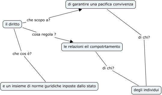 Questa Cmap, creata con IHMC CmapTools, contiene informazioni relative a: il diritto, il diritto che scopo a? di garantire una pacifica convivenza, le relazioni eil compotrtamento di chi? degli individui, di garantire una pacifica convivenza di chi? degli individui, il diritto cosa regola ? le relazioni eil compotrtamento, il diritto che cos è? e un insieme di norme guridiche inposte dallo stato