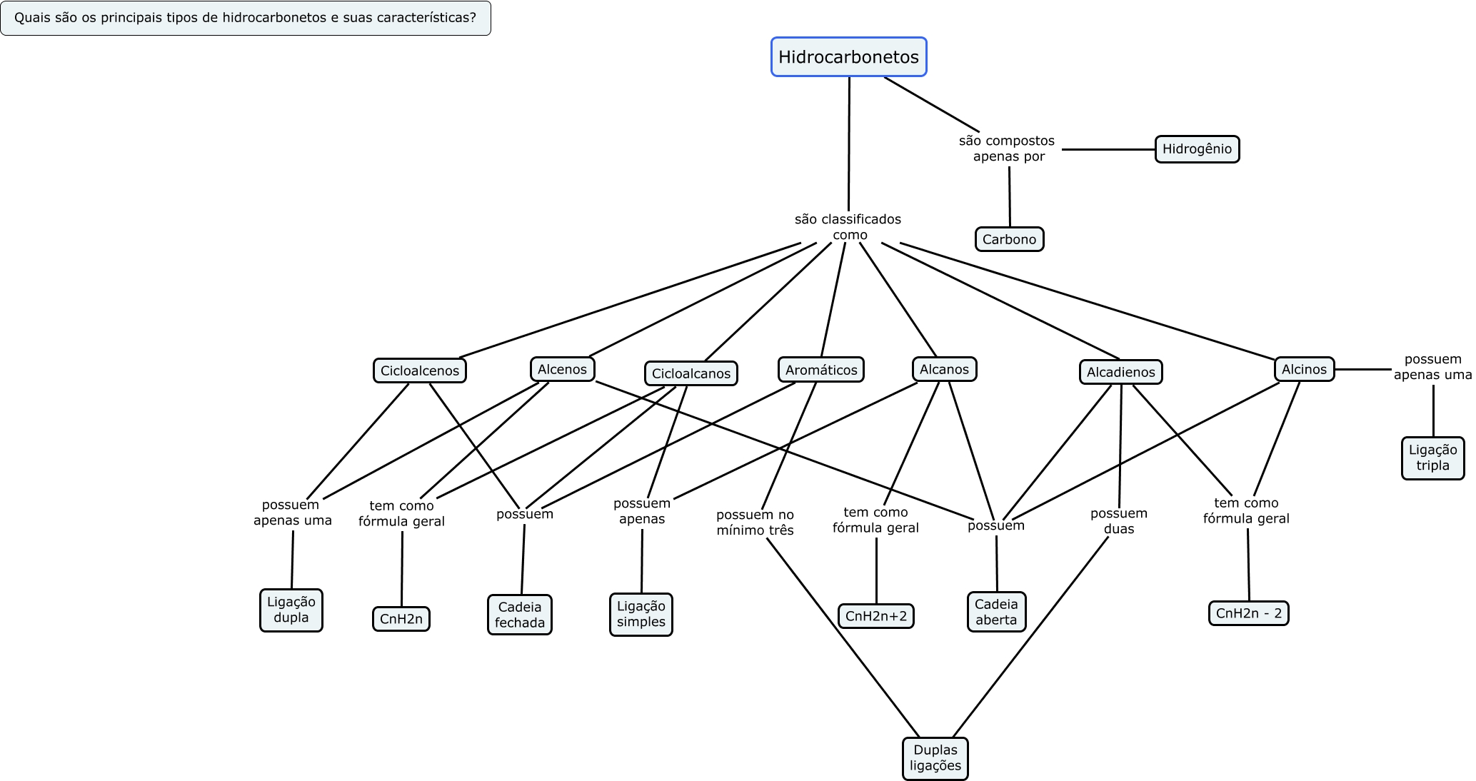 Esse mapa conceitual, produzido no IHMC CmapTools, tem a informação relacionada a: Hidrocatrbonetos, Alcadienos possuem duas Duplas ligações, Alcanos possuem Cadeia aberta, Hidrocarbonetos são classificados como Cicloalcenos, Alcenos tem como fórmula geral CnH2n, Alcenos possuem apenas uma Ligação dupla, Hidrocarbonetos são compostos apenas por Hidrogênio, Alcinos possuem apenas uma Ligação tripla, Alcanos tem como fórmula geral CnH2n+2, Hidrocarbonetos são classificados como Aromáticos, Aromáticos possuem Cadeia fechada, Alcenos possuem Cadeia aberta, Cicloalcanos tem como fórmula geral CnH2n, Hidrocarbonetos são classificados como Alcenos, Cicloalcanos possuem apenas Ligação simples, Alcinos possuem Cadeia aberta, Hidrocarbonetos são classificados como Alcanos, Alcanos possuem apenas Ligação simples, Hidrocarbonetos são classificados como Alcadienos, Hidrocarbonetos são classificados como Cicloalcanos, Aromáticos possuem no mínimo três Duplas ligações