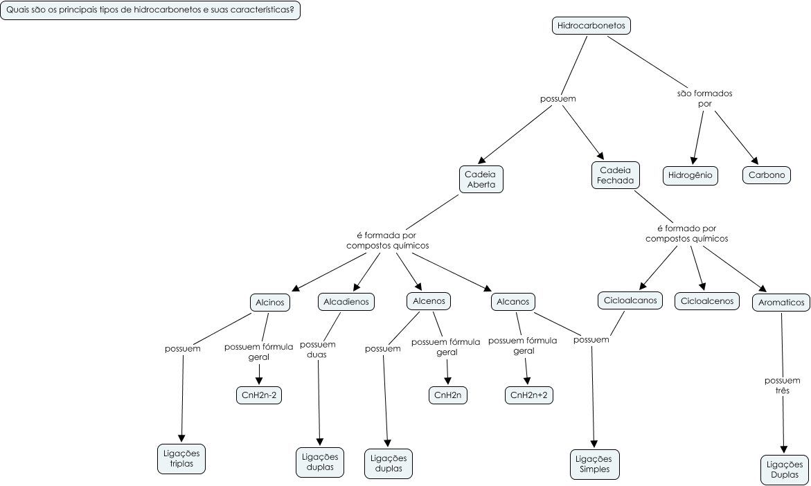 Esse mapa conceitual, produzido no IHMC CmapTools, tem a informação relacionada a: Hidrocatrbonetos 2D, Hidrocarbonetos são formados por Hidrogênio, Aromaticos possuem três Ligações Duplas, Cadeia Fechada é formado por compostos químicos Cicloalcanos, Cadeia Fechada é formado por compostos químicos Aromaticos, Alcenos possuem Ligações duplas, Alcenos possuem fórmula geral CnH2n, Cadeia Aberta é formada por compostos químicos Alcinos, Cadeia Aberta é formada por compostos químicos Alcanos, Alcanos possuem Ligações Simples, Hidrocarbonetos possuem Cadeia Aberta, Cadeia Aberta é formada por compostos químicos Alcenos, Cadeia Aberta é formada por compostos químicos Alcadienos, Alcinos possuem Ligações triplas, Alcadienos possuem duas Ligações duplas, Cicloalcanos possuem Ligações Simples, Alcanos possuem fórmula geral CnH2n+2, Alcinos possuem fórmula geral CnH2n-2, Hidrocarbonetos possuem Cadeia Fechada, Cadeia Fechada é formado por compostos químicos Cicloalcenos, Hidrocarbonetos são formados por Carbono