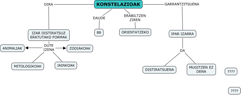 IHMC CmapTools-ekin sortu den kontzeptu-mapa honek honi buruzko informazioa du: TXANELA 1 KONSTELAZIOAK, IZAR DISTIRATSUZ ERATUTAKO FORMAK DUTE IZENA JAINKOAK, IZAR DISTIRATSUZ ERATUTAKO FORMAK DUTE IZENA ZODIAKOAK, KONSTELAZIOAK ERABILTZEN ZIREN ORIENTATZEKO, IPAR IZARRA DA DISTIRATSUENA, IZAR DISTIRATSUZ ERATUTAKO FORMAK DUTE IZENA ANIMALIAK, KONSTELAZIOAK GARRANTZITSUENA IPAR IZARRA, KONSTELAZIOAK DIRA IZAR DISTIRATSUZ ERATUTAKO FORMAK, KONSTELAZIOAK DAUDE 88, IPAR IZARRA DA MUGITZEN EZ DENA, IZAR DISTIRATSUZ ERATUTAKO FORMAK DUTE IZENA MITOLOGIKOAK