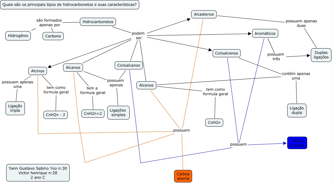 Esse mapa conceitual, produzido no IHMC CmapTools, tem a informação relacionada a: Hidrocatrbonetos 2c, Hidrocarbonetos podem ser Alcinos, Cicloalcenos contêm apenas uma Ligação dupla, Alcanos tem a formula geral CnH2n+2, Alcadienos possuem Cadeia aberta, Cicloalcenos possuem Cadeia fechada, Aromáticos possuem três Duplas ligações, Alcinos tem como formula geral CnH2n - 2, Alcenos contêm apenas uma Ligação dupla, Alcanos possuem apenas Ligações simples, Hidrocarbonetos são formados apenas por Hidrogênio, Hidrocarbonetos podem ser Alcanos, Hidrocarbonetos podem ser Alcadienos, Cicloalcanos possuem Cadeia fechada, Alcenos possuem Cadeia aberta, Hidrocarbonetos podem ser Cicloalcenos, Aromáticos possuem Cadeia fechada, Hidrocarbonetos podem ser Aromáticos, Alcinos possuem Cadeia aberta, Hidrocarbonetos podem ser Cicloalcanos, Alcanos possuem Cadeia aberta