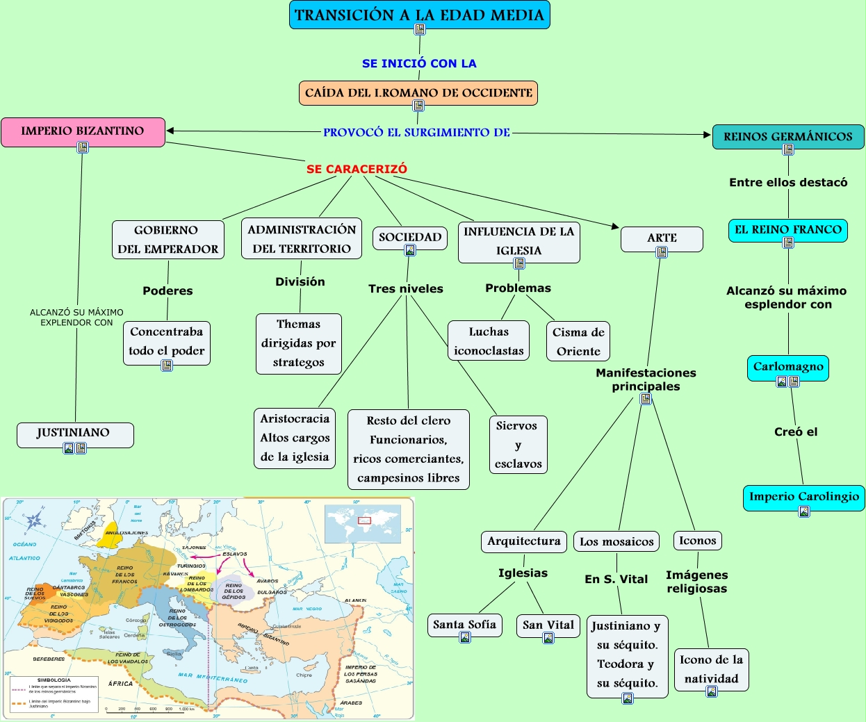 Este Cmap, tiene información relacionada con: BIZANCIO Y EL IMPERIO CAROLINGIO, Arquitectura Iglesias Santa Sofía, REINOS GERMÁNICOS Entre ellos destacó EL REINO FRANCO, IMPERIO BIZANTINO SE CARACERIZÓ SOCIEDAD, IMPERIO BIZANTINO SE CARACERIZÓ ARTE, CAÍDA DEL I.ROMANO DE OCCIDENTE PROVOCÓ EL SURGIMIENTO DE IMPERIO BIZANTINO, ARTE Manifestaciones principales Iconos, IMPERIO BIZANTINO ALCANZÓ SU MÁXIMO EXPLENDOR CON JUSTINIANO, SOCIEDAD Tres niveles Aristocracia Altos cargos de la iglesia, IMPERIO BIZANTINO SE CARACERIZÓ ADMINISTRACIÓN DEL TERRITORIO, IMPERIO BIZANTINO SE CARACERIZÓ GOBIERNO DEL EMPERADOR, ARTE Manifestaciones principales Los mosaicos, Los mosaicos En S. Vital Justiniano y su séquito. Teodora y su séquito., GOBIERNO DEL EMPERADOR Poderes Concentraba todo el poder, EL REINO FRANCO Alcanzó su máximo esplendor con Carlomagno, Carlomagno Creó el Imperio Carolingio, INFLUENCIA DE LA IGLESIA Problemas Cisma de Oriente, Arquitectura Iglesias San Vital, INFLUENCIA DE LA IGLESIA Problemas Luchas iconoclastas, SOCIEDAD Tres niveles Resto del clero Funcionarios, ricos comerciantes, campesinos libres, Iconos Imágenes religiosas Icono de la natividad