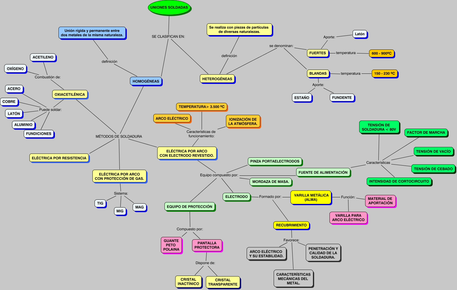 Este Cmap, tiene información relacionada con: Uniones Soldadas, ELÉCTRICA POR ARCO CON ELECTRODO REVESTIDO. Características de funcionamiento: IONIZACIÓN DE LA ATMÓSFERA., UNIONES SOLDADAS SE CLASIFICAN EN: HOMOGÉNEAS, ELÉCTRICA POR ARCO CON ELECTRODO REVESTIDO. Equipo compuesto por: MORDAZA DE MASA., RECUBRIMIENTO Favorece: CARACTERÍSTICAS MECÁNICAS DEL METAL., INTENSIDAD DE CORTOCIRCUITO Características TENSIÓN DE VACÍO, ELÉCTRICA POR ARCO CON ELECTRODO REVESTIDO. Equipo compuesto por: EQUIPO DE PROTECCIÓN, UNIONES SOLDADAS SE CLASIFICAN EN: HETEROGÉNEAS, HETEROGÉNEAS se denominan: FUERTES, HETEROGÉNEAS definición Se realiza con piezas de partículas de diversas naturalezas., HOMOGÉNEAS MÉTODOS DE SOLDADURA ELÉCTRICA POR ARCO CON PROTECCIÓN DE GAS., ELÉCTRICA POR ARCO CON ELECTRODO REVESTIDO. Equipo compuesto por: FUENTE DE ALIMENTACIÓN, PANTALLA PROTECTORA Dispone de: CRISTAL INACTÍNICO, RECUBRIMIENTO Formado por: VARILLA METÁLICA (ALMA), BLANDAS Aporte: ESTAÑO, HOMOGÉNEAS MÉTODOS DE SOLDADURA OXIACETILÉNICA, HETEROGÉNEAS se denominan: BLANDAS, FUERTES Aporte: Latón, HOMOGÉNEAS definición Unión rígida y permanente entre dos metales de la misma naturaleza., ELÉCTRICA POR ARCO CON ELECTRODO REVESTIDO. Características de funcionamiento: ARCO ELÉCTRICO, HOMOGÉNEAS MÉTODOS DE SOLDADURA ELÉCTRICA POR RESISTENCIA