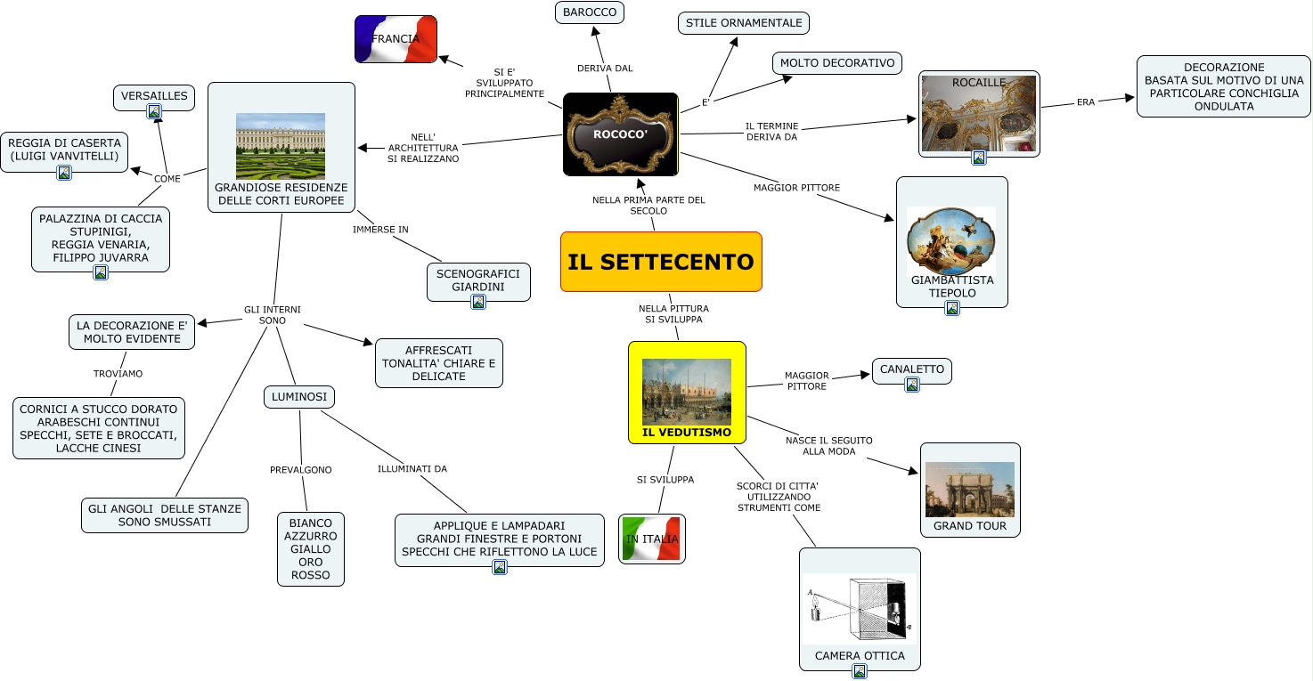Questa Cmap, creata con IHMC CmapTools, contiene informazioni relative a: SETTECENTO, IL VEDUTISMO NASCE IL SEGUITO ALLA MODA GRAND TOUR, ROCOCO' MAGGIOR PITTORE GIAMBATTISTA TIEPOLO, GRANDIOSE RESIDENZE DELLE CORTI EUROPEE COME PALAZZINA DI CACCIA STUPINIGI, REGGIA VENARIA, FILIPPO JUVARRA, ROCOCO' IL TERMINE DERIVA DA ROCAILLE, LA DECORAZIONE E' MOLTO EVIDENTE TROVIAMO CORNICI A STUCCO DORATO ARABESCHI CONTINUI SPECCHI, SETE E BROCCATI, LACCHE CINESI, IL SETTECENTO NELLA PITTURA SI SVILUPPA IL VEDUTISMO, IL VEDUTISMO MAGGIOR PITTORE CANALETTO, GRANDIOSE RESIDENZE DELLE CORTI EUROPEE GLI INTERNI SONO LUMINOSI, LUMINOSI ILLUMINATI DA APPLIQUE E LAMPADARI GRANDI FINESTRE E PORTONI SPECCHI CHE RIFLETTONO LA LUCE, ROCOCO' SI E' SVILUPPATO PRINCIPALMENTE FRANCIA, GRANDIOSE RESIDENZE DELLE CORTI EUROPEE IMMERSE IN SCENOGRAFICI GIARDINI, GRANDIOSE RESIDENZE DELLE CORTI EUROPEE GLI INTERNI SONO AFFRESCATI TONALITA' CHIARE E DELICATE, ROCAILLE ERA DECORAZIONE BASATA SUL MOTIVO DI UNA PARTICOLARE CONCHIGLIA ONDULATA, ROCOCO' NELL' ARCHITETTURA SI REALIZZANO GRANDIOSE RESIDENZE DELLE CORTI EUROPEE, ROCOCO' E' STILE ORNAMENTALE, IL SETTECENTO NELLA PRIMA PARTE DEL SECOLO ROCOCO', LUMINOSI PREVALGONO BIANCO AZZURRO GIALLO ORO ROSSO, IL VEDUTISMO SCORCI DI CITTA' UTILIZZANDO STRUMENTI COME CAMERA OTTICA, GRANDIOSE RESIDENZE DELLE CORTI EUROPEE COME REGGIA DI CASERTA (LUIGI VANVITELLI), GRANDIOSE RESIDENZE DELLE CORTI EUROPEE GLI INTERNI SONO LA DECORAZIONE E' MOLTO EVIDENTE