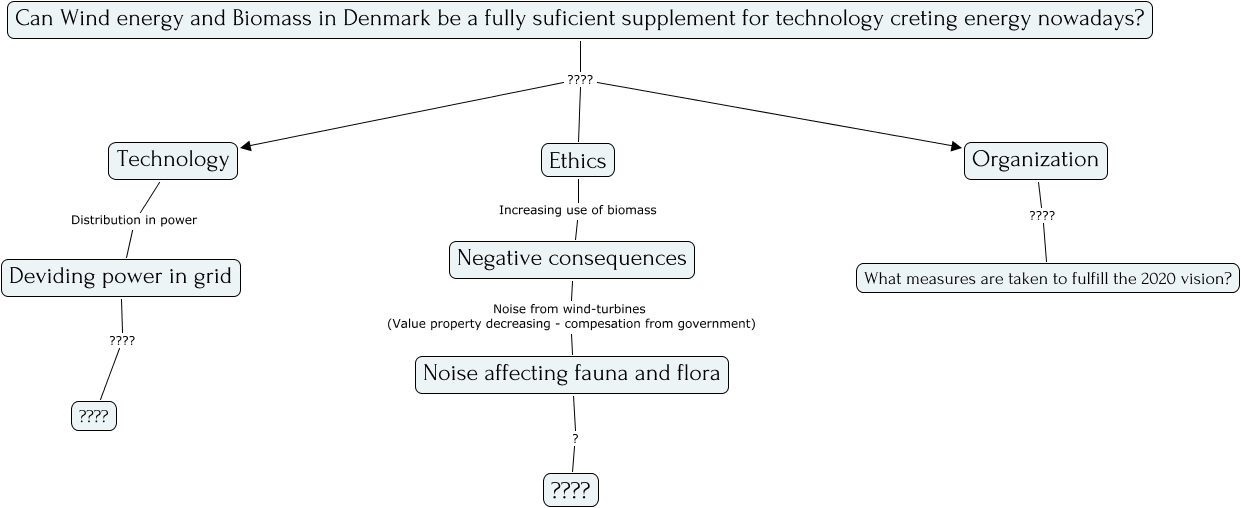 This Concept Map, created with IHMC CmapTools, has information related to: Untitled 1, Deviding power in grid ???? ????, Negative consequences Noise from wind-turbines (Value property decreasing - compesation from government) Noise affecting fauna and flora, Technology Distribution in power Deviding power in grid, Ethics Increasing use of biomass Negative consequences, Noise affecting fauna and flora ? ????, Organization ???? What measures are taken to fulfill the 2020 vision?, Can Wind energy and Biomass in Denmark be a fully suficient supplement for technology creting energy nowadays? ???? Organization, Can Wind energy and Biomass in Denmark be a fully suficient supplement for technology creting energy nowadays? ???? Technology, Can Wind energy and Biomass in Denmark be a fully suficient supplement for technology creting energy nowadays? ???? Ethics
