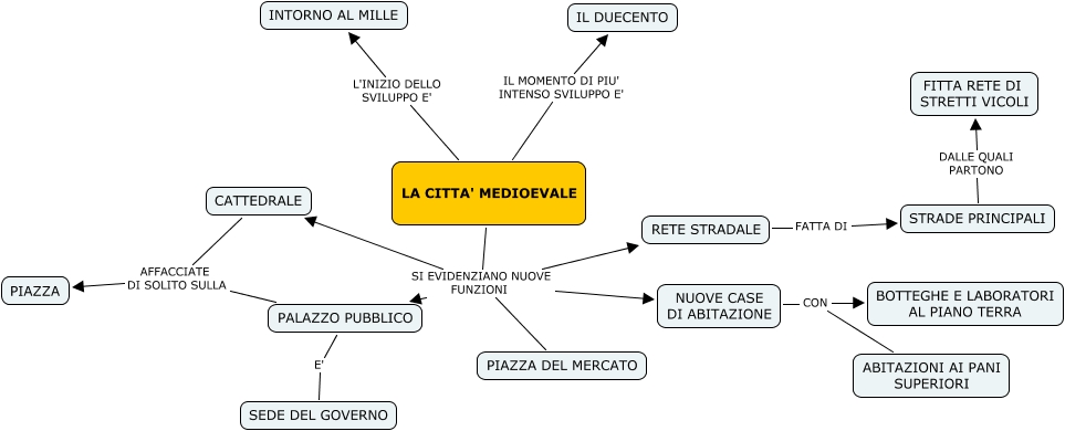 Questa Cmap, creata con IHMC CmapTools, contiene informazioni relative a: CITTA' MEDIOEVALE, CATTEDRALE AFFACCIATE DI SOLITO SULLA PIAZZA, PALAZZO PUBBLICO E' SEDE DEL GOVERNO, NUOVE CASE DI ABITAZIONE CON ABITAZIONI AI PANI SUPERIORI, LA CITTA' MEDIOEVALE SI EVIDENZIANO NUOVE FUNZIONI CATTEDRALE, LA CITTA' MEDIOEVALE SI EVIDENZIANO NUOVE FUNZIONI PIAZZA DEL MERCATO, RETE STRADALE FATTA DI STRADE PRINCIPALI, STRADE PRINCIPALI DALLE QUALI PARTONO FITTA RETE DI STRETTI VICOLI, NUOVE CASE DI ABITAZIONE CON BOTTEGHE E LABORATORI AL PIANO TERRA, PALAZZO PUBBLICO AFFACCIATE DI SOLITO SULLA PIAZZA, LA CITTA' MEDIOEVALE SI EVIDENZIANO NUOVE FUNZIONI NUOVE CASE DI ABITAZIONE, LA CITTA' MEDIOEVALE L'INIZIO DELLO SVILUPPO E' INTORNO AL MILLE, LA CITTA' MEDIOEVALE SI EVIDENZIANO NUOVE FUNZIONI PALAZZO PUBBLICO, LA CITTA' MEDIOEVALE SI EVIDENZIANO NUOVE FUNZIONI RETE STRADALE, LA CITTA' MEDIOEVALE IL MOMENTO DI PIU' INTENSO SVILUPPO E' IL DUECENTO