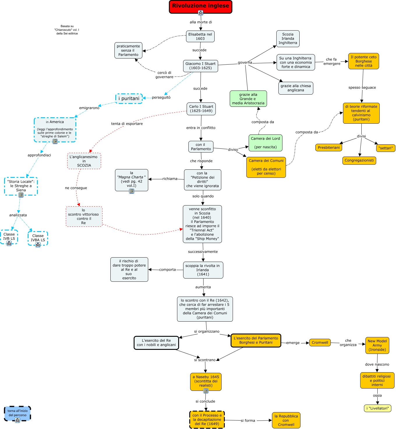 Questa Cmap, creata con IHMC CmapTools, contiene informazioni relative a: prima rivoluzione inglese, New Model Army (Ironside) dove nascono dibattiti religiosi e politici interni, Il potente ceto Borghese nelle città spesso seguace di teorie riformate tendenti al calvinismo (puritani), Cromwell che organizza New Model Army (Ironside), a Naseby 1645 (scontitta dei realisti) si conclude con il Processo e la decapitazione del Re (1649), Elisabetta nel 1603 praticamente senza il Parlamento, Elisabetta nel 1603 succede Giacomo I Stuart (1603-1625), con il Parlamento diviso Camera dei Lord (per nascita), Giacomo I Stuart (1603-1625) governa grazie alla Grande e media Aristocrazia, di teorie riformate tendenti al calvinismo (puritani) divisi Presbiteriani, Giacomo I Stuart (1603-1625) governa grazie alla chiesa anglicana, L'anglicanesimo in SCOZIA ne consegue lo scontro vittorioso contro il Re, in America (leggi l'approfondimento sulle prime colonie e le "streghe di Salem") approfondisci "Storia Locale": le Streghe a Siena, Camera dei Lord (per nascita) composta da grazie alla Grande e media Aristocrazia, L'esercito del Re con i nobili e anglicani si scontrano a Naseby 1645 (scontitta dei realisti), con la "Petizione dei diritti" che viene ignorata richiama la "Magna Charta" (vedi pg. 42 vol.I), Carlo I Stuart (1625-1649) tenta di esportare L'anglicanesimo in SCOZIA, Giacomo I Stuart (1603-1625) cercò di governare praticamente senza il Parlamento, venne sconfitto in Scozia (nel 1640) il Parlamento riesce ad imporre il "Triennal Act" e l'abolizione della "Ship Money" successivamente scoppia la rivolta in Irlanda (1641), Carlo I Stuart (1625-1649) entra in conflitto con il Parlamento, Giacomo I Stuart (1603-1625) perseguitò i puritani