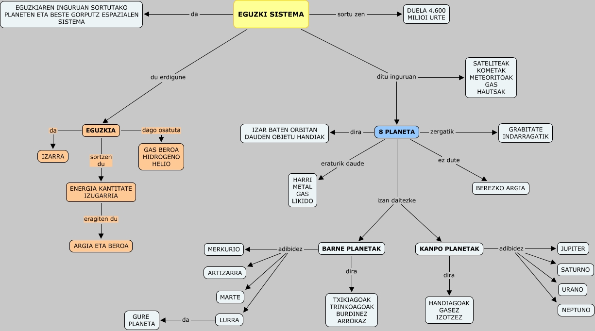 IHMC CmapTools-ekin sortu den kontzeptu-mapa honek honi buruzko informazioa du: TXANELA 1 EGUZKI SISTEMA, KANPO PLANETAK adibidez SATURNO, EGUZKI SISTEMA sortu zen DUELA 4.600 MILIOI URTE, LURRA da GURE PLANETA, BARNE PLANETAK adibidez MERKURIO, 8 PLANETA ez dute BEREZKO ARGIA, 8 PLANETA izan daitezke KANPO PLANETAK, KANPO PLANETAK adibidez NEPTUNO, 8 PLANETA zergatik GRABITATE INDARRAGATIK, EGUZKIA sortzen du ENERGIA KANTITATE IZUGARRIA, BARNE PLANETAK dira TXIKIAGOAK TRINKOAGOAK BURDINEZ ARROKAZ, BARNE PLANETAK adibidez MARTE, KANPO PLANETAK dira HANDIAGOAK GASEZ IZOTZEZ, 8 PLANETA eraturik daude HARRI METAL GAS LIKIDO, EGUZKIA da IZARRA, EGUZKI SISTEMA ditu inguruan SATELITEAK KOMETAK METEORITOAK GAS HAUTSAK, BARNE PLANETAK adibidez ARTIZARRA, KANPO PLANETAK adibidez URANO, BARNE PLANETAK adibidez LURRA, EGUZKI SISTEMA du erdigune EGUZKIA, EGUZKI SISTEMA da EGUZKIAREN INGURUAN SORTUTAKO PLANETEN ETA BESTE GORPUTZ ESPAZIALEN SISTEMA