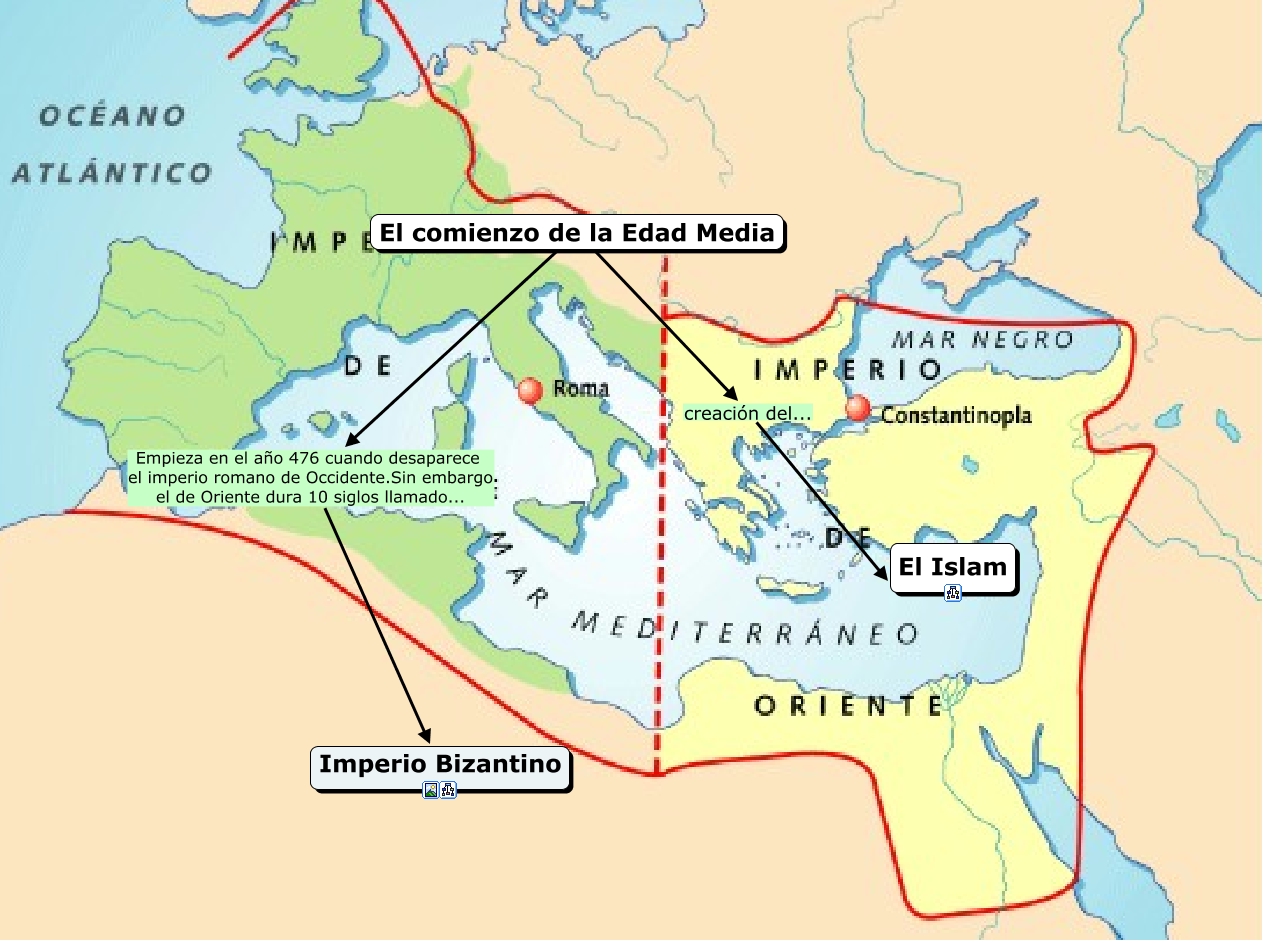 Este Cmap, tiene información relacionada con: tema1CCSS, El comienzo de la Edad Media Empieza en el año 476 cuando desaparece el imperio romano de Occidente.Sin embargo el de Oriente dura 10 siglos llamado... Imperio Bizantino, El comienzo de la Edad Media creación del... El Islam