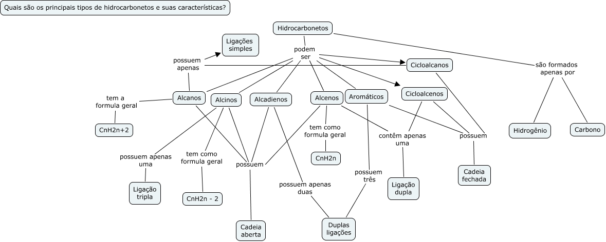 Esse mapa conceitual, produzido no IHMC CmapTools, tem a informação relacionada a: Hidrocatrbonetos sexys, Hidrocarbonetos podem ser Alcinos, Cicloalcenos contêm apenas uma Ligação dupla, Alcanos tem a formula geral CnH2n+2, Alcadienos possuem Cadeia aberta, Cicloalcenos possuem Cadeia fechada, Aromáticos possuem três Duplas ligações, Alcinos tem como formula geral CnH2n - 2, Alcenos contêm apenas uma Ligação dupla, Alcanos possuem apenas Ligações simples, Hidrocarbonetos são formados apenas por Hidrogênio, Hidrocarbonetos podem ser Alcanos, Hidrocarbonetos podem ser Alcadienos, Cicloalcanos possuem Cadeia fechada, Alcenos possuem Cadeia aberta, Hidrocarbonetos podem ser Cicloalcenos, Aromáticos possuem Cadeia fechada, Hidrocarbonetos podem ser Aromáticos, Alcinos possuem Cadeia aberta, Hidrocarbonetos podem ser Cicloalcanos, Alcanos possuem Cadeia aberta