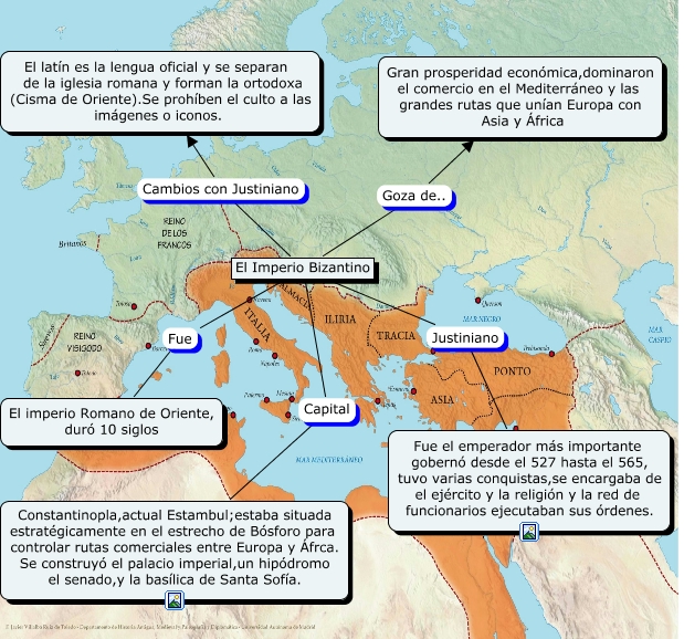 Este Cmap, tiene información relacionada con: imperio bizantino, El Imperio Bizantino Justiniano Fue el emperador más importante gobernó desde el 527 hasta el 565, tuvo varias conquistas,se encargaba de el ejército y la religión y la red de funcionarios ejecutaban sus órdenes., El Imperio Bizantino Fue El imperio Romano de Oriente, duró 10 siglos, El Imperio Bizantino Capital Constantinopla,actual Estambul;estaba situada estratégicamente en el estrecho de Bósforo para controlar rutas comerciales entre Europa y Áfrca. Se construyó el palacio imperial,un hipódromo el senado,y la basílica de Santa Sofía., El Imperio Bizantino Cambios con Justiniano El latín es la lengua oficial y se separan de la iglesia romana y forman la ortodoxa (Cisma de Oriente).Se prohíben el culto a las imágenes o iconos., El Imperio Bizantino Goza de.. Gran prosperidad económica,dominaron el comercio en el Mediterráneo y las grandes rutas que unían Europa con Asia y África