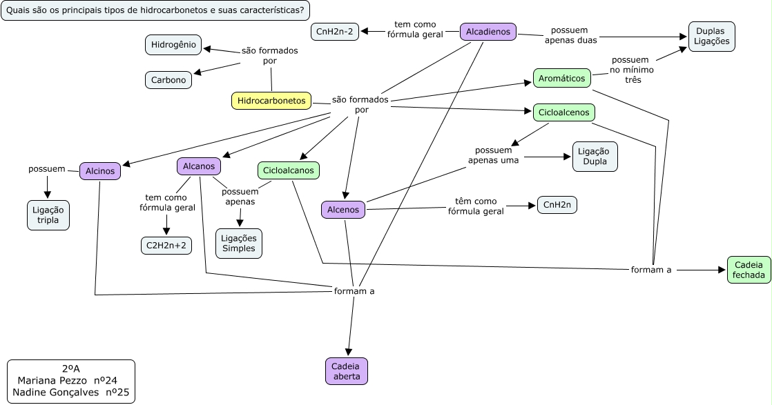 Esse mapa conceitual, produzido no IHMC CmapTools, tem a informação relacionada a: Hidrocarbonetos Mari e Nadine, Aromáticos formam a Cadeia fechada, Cicloalcenos possuem apenas uma Ligação Dupla, Alcinos formam a Cadeia aberta, Hidrocarbonetos são formados por Cicloalcanos, Cicloalcenos formam a Cadeia fechada, Hidrocarbonetos são formados por Alcenos, Alcinos possuem Ligação tripla, Hidrocarbonetos são formados por Cicloalcenos, Aromáticos possuem no mínimo três Duplas Ligações, Hidrocarbonetos são formados por Alcadienos, Hidrocarbonetos são formados por Alcinos, Alcenos possuem apenas uma Ligação Dupla, Alcanos formam a Cadeia aberta, Cicloalcanos possuem apenas Ligações Simples, Hidrocarbonetos são formados por Hidrogênio, Alcenos formam a Cadeia aberta, Alcanos tem como fórmula geral C2H2n+2, Cicloalcanos formam a Cadeia fechada, Hidrocarbonetos são formados por Alcanos, Alcadienos formam a Cadeia aberta