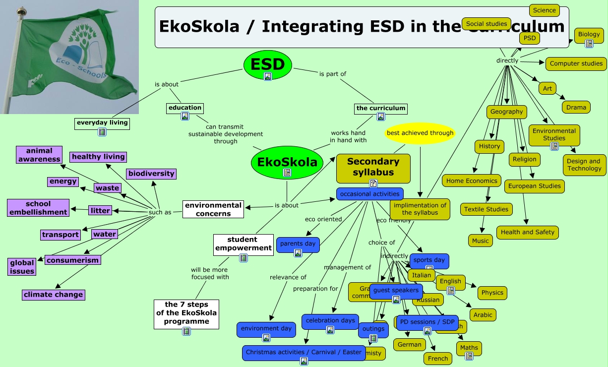 This Concept Map, created with IHMC CmapTools, has information related to: PD B'Kara - ppt, implimentation of the syllabus indirectly Graphical communication, environmental concerns such as climate change, student empowerment will be more focused with the 7 steps of the EkoSkola programme, implimentation of the syllabus directly Textile Studies, implimentation of the syllabus indirectly German, occasional activities preparation for Christmas activities / Carnival / Easter, implimentation of the syllabus directly Religion, implimentation of the syllabus indirectly Arabic, environmental concerns such as consumerism, occasional activities eco oriented parents day, environmental concerns such as energy, implimentation of the syllabus indirectly Physics, ESD is part of the curriculum, environmental concerns such as biodiversity, implimentation of the syllabus directly Biology, implimentation of the syllabus indirectly English, environmental concerns such as water, environmental concerns such as waste, implimentation of the syllabus indirectly Maths, implimentation of the syllabus indirectly Chemisty