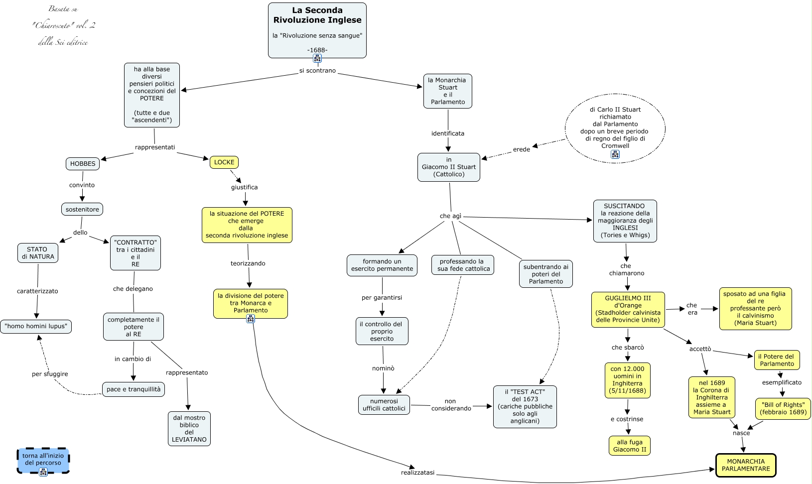 Questa Cmap, creata con IHMC CmapTools, contiene informazioni relative a: seconda rivoluzione inglese, professando la sua fede cattolica numerosi ufficili cattolici, il Potere del Parlamento esemplificato "Bill of Rights" (febbraio 1689), STATO di NATURA caratterizzato "homo homini lupus", LOCKE giustifica la situazione del POTERE che emerge dalla seconda rivoluzione inglese, ha alla base diversi pensieri politici e concezioni del POTERE (tutte e due "ascendenti") rappresentati LOCKE, con 12.000 uomini in Inghiterra (5/11/1688) e costrinse alla fuga Giacomo II, la divisione del potere tra Monarca e Parlamento realizzatasi MONARCHIA PARLAMENTARE, completamente il potere al RE in cambio di pace e tranquillità, formando un esercito permanente per garantirsi il controllo del proprio esercito, il controllo del proprio esercito nominò numerosi ufficili cattolici, in Giacomo II Stuart (Cattolico) che agì formando un esercito permanente, "CONTRATTO" tra i cittadini e il RE che delegano completamente il potere al RE, di Carlo II Stuart richiamato dal Parlamento dopo un breve periodo di regno del figlio di Cromwell erede in Giacomo II Stuart (Cattolico), ha alla base diversi pensieri politici e concezioni del POTERE (tutte e due "ascendenti") rappresentati HOBBES, nel 1689 la Corona di Inghilterra assieme a Maria Stuart nasce MONARCHIA PARLAMENTARE, in Giacomo II Stuart (Cattolico) che agì SUSCITANDO la reazione della maggioranza degli INGLESI (Tories e Whigs), GUGLIELMO III d'Orange (Stadholder calvinista delle Provincie Unite) accettò nel 1689 la Corona di Inghilterra assieme a Maria Stuart, la Monarchia Stuart e il Parlamento identificata in Giacomo II Stuart (Cattolico), "Bill of Rights" (febbraio 1689) nasce MONARCHIA PARLAMENTARE, numerosi ufficili cattolici non considerando il "TEST ACT" del 1673 (cariche pubbliche solo agli anglicani)