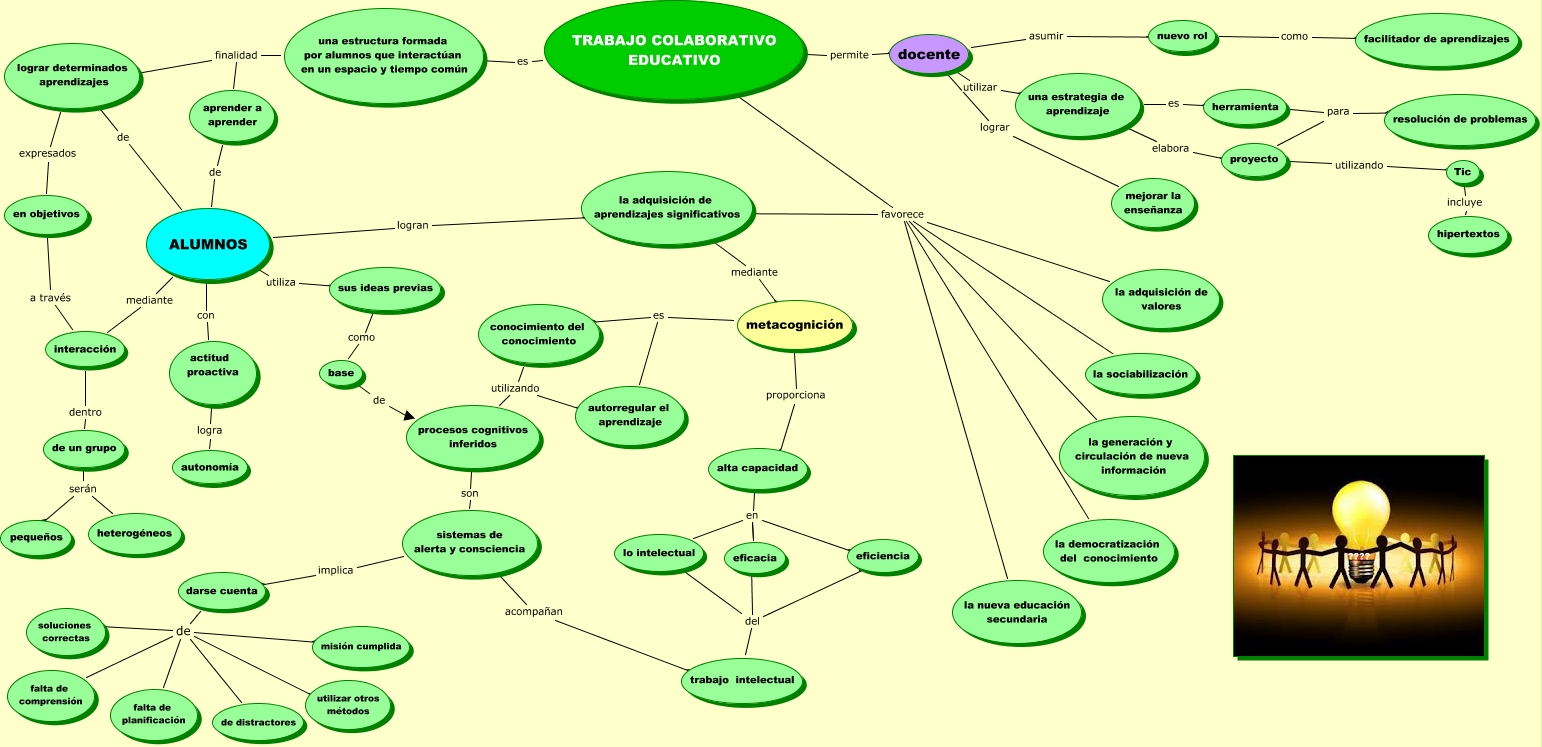 Este Cmap, tiene información relacionada con: Trabajo colaborativo, Tic incluye hipertextos, ALUMNOS mediante interacción, TRABAJO COLABORATIVO EDUCATIVO favorece la democratización del conocimiento, TRABAJO COLABORATIVO EDUCATIVO favorece la generación y circulación de nueva información, metacognición proporciona alta capacidad, nuevo rol como facilitador de aprendizajes, aprender a aprender de ALUMNOS, docente utilizar una estrategia de aprendizaje, alta capacidad en eficiencia, trabajo intelectual del lo intelectual, de un grupo serán pequeños, alta capacidad en eficacia, TRABAJO COLABORATIVO EDUCATIVO favorece la sociabilización, sistemas de alerta y consciencia acompañan trabajo intelectual, procesos cognitivos inferidos son sistemas de alerta y consciencia, lograr determinados aprendizajes expresados en objetivos, de un grupo serán heterogéneos, TRABAJO COLABORATIVO EDUCATIVO favorece la adquisición de valores, trabajo intelectual del eficiencia, darse cuenta de falta de planificación
